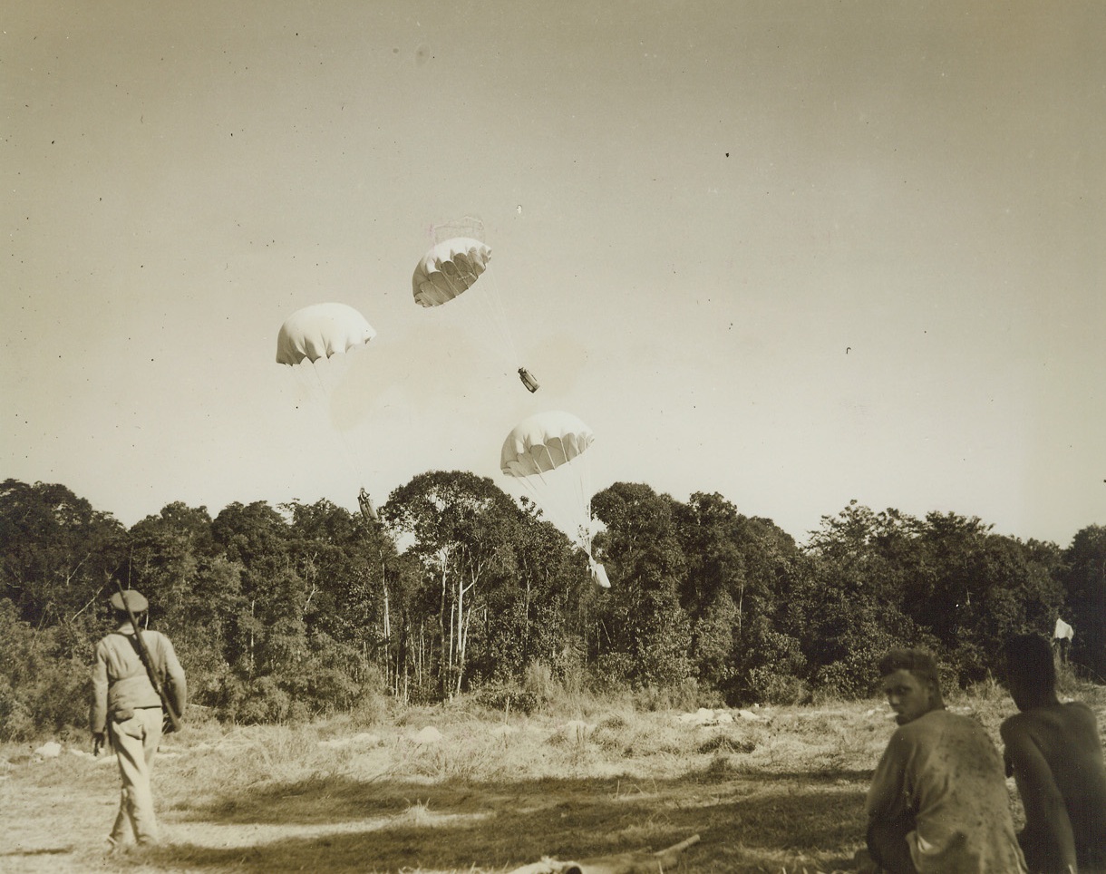 Fresh “Eggs” for Japs, 1/26/1944. Bombs from planes of the U.S. Army 5th Air Force, explode on installations and the Jap airfield at Cape Gloucester, in this photo just released in the U.S. The raid was part of the “softening up” process which preceded the Allied landing at the Southwest Pacific island of New Britain. When the landing was effected, American engineers immediately set to work to put the airfield in shape for use against the Jap base of Rabaul, New Britain.Credit: U.S. Army Air Force photo from ACME