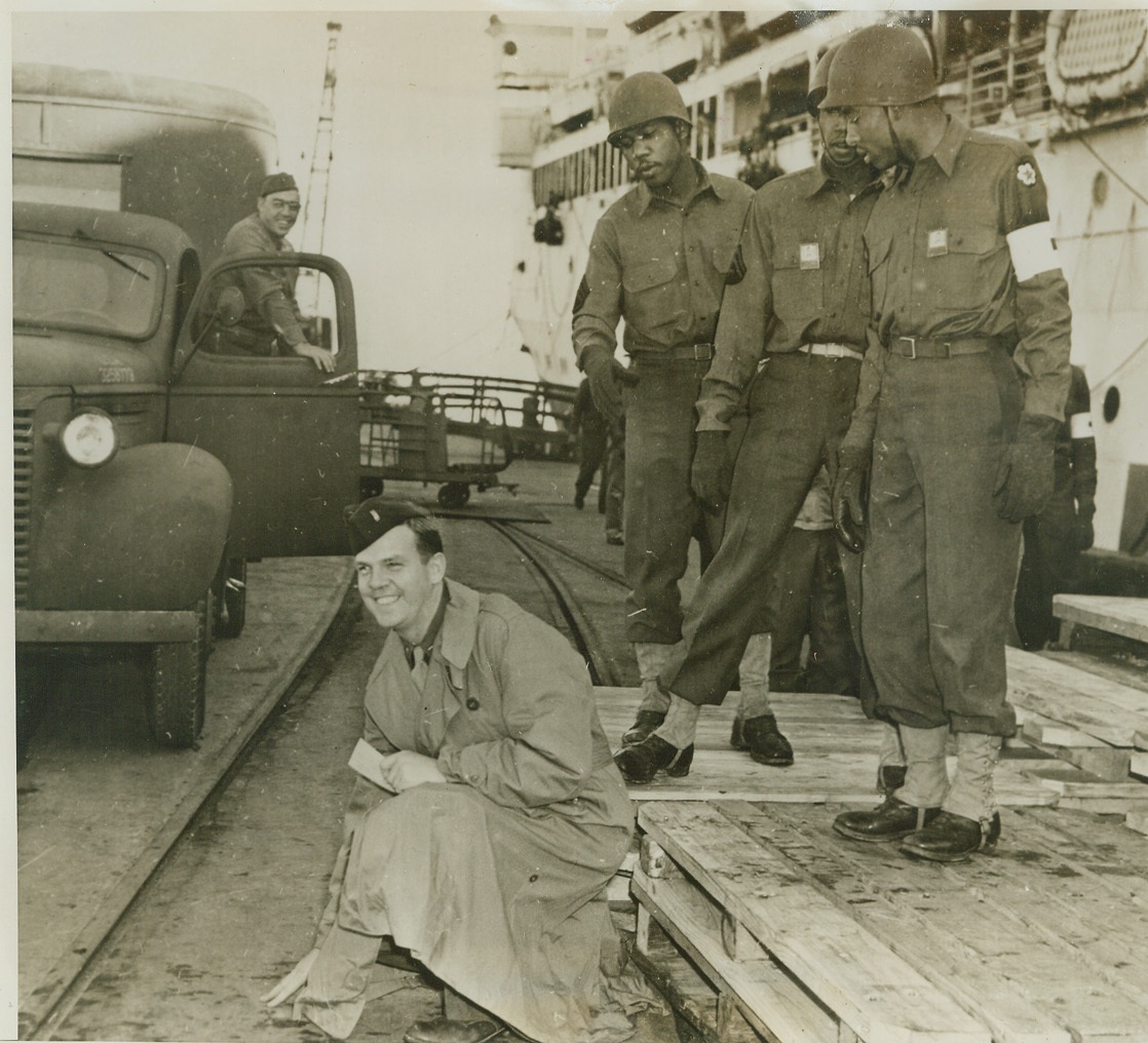 Heave – Ho, 1/6/1944. Saidor, New Guinea — Fresh off an LST, this jeep makes a bumpy trip up the beach at Saidor, New Guinea. Just landed, a group of American soldiers escorts the tiny car over the rough path to newly-laid road mats.Credit (Signal Corps radio telephoto from ACME