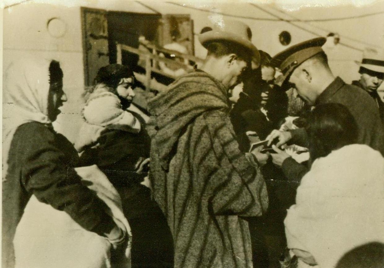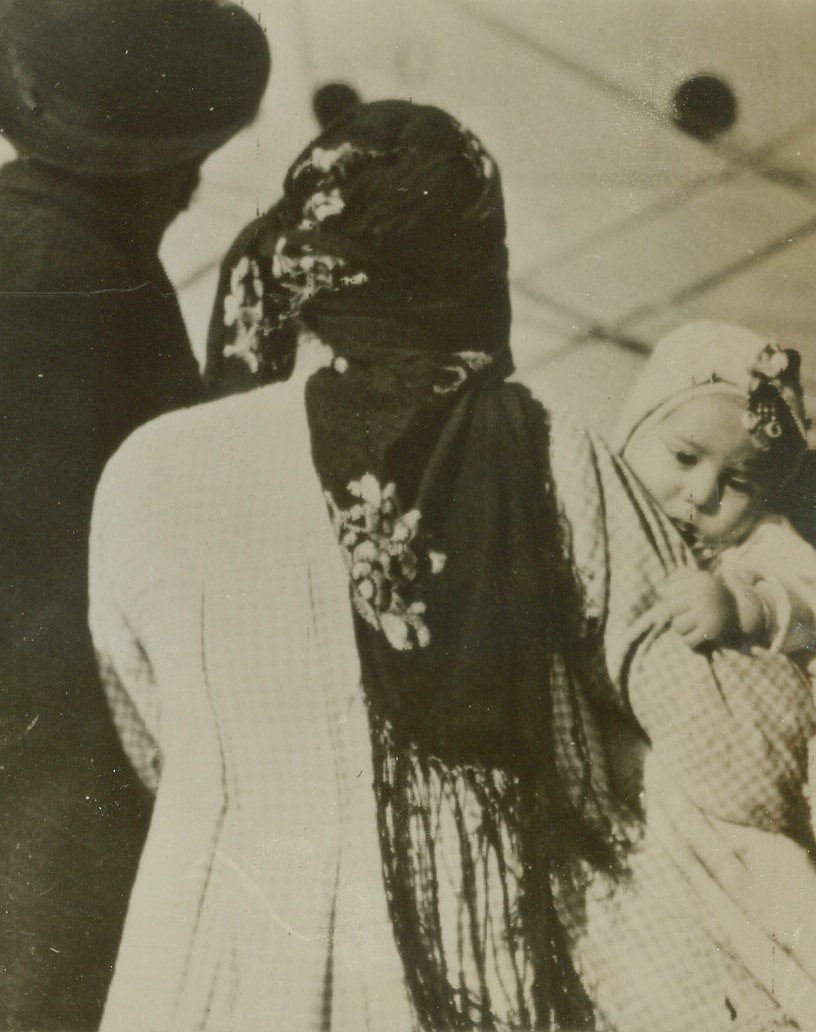 Heading for a New Homeland, 1/10/1944. A North African Port—A refugee family, left homeless by Hitler’s ruthless advance in Europe, wait to board a ship at a North African port, which will take them to Palestine. There they will be given a chance to establish themselves as agricultural settlers. Credit: OWI radiophoto from ACME.