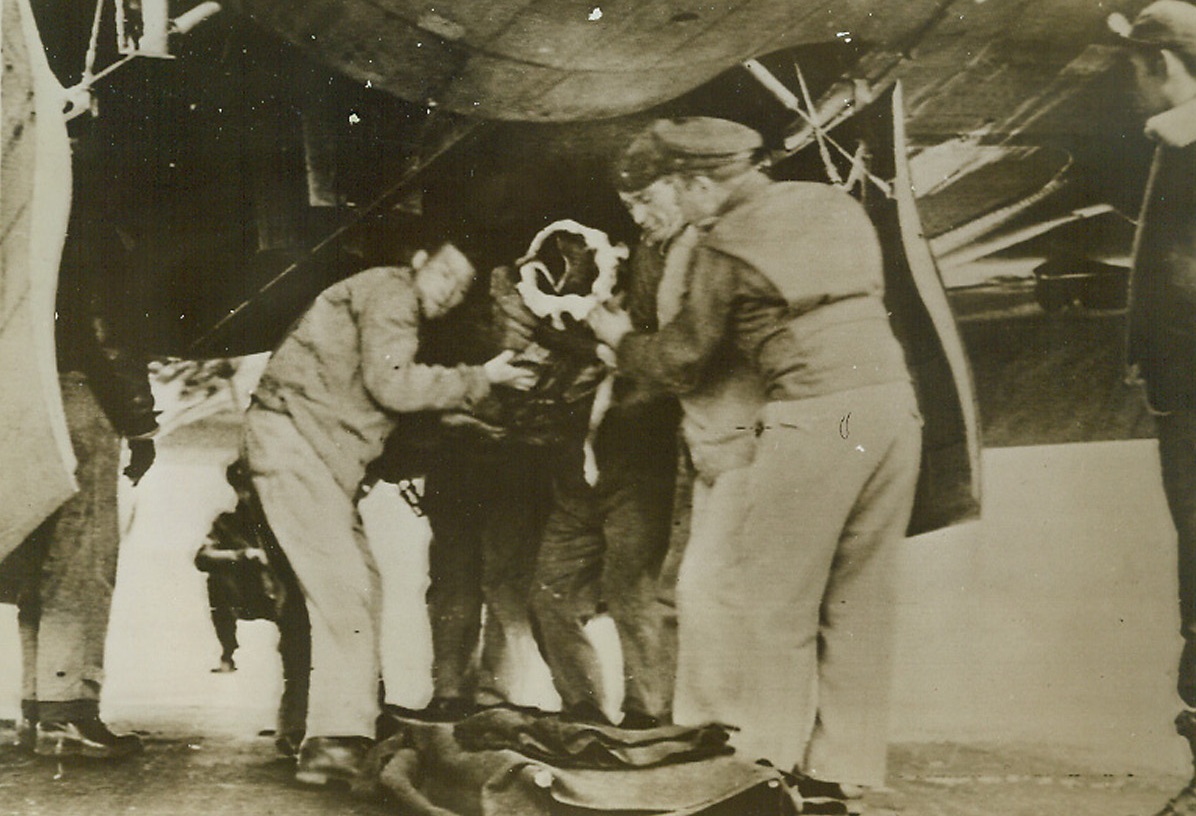 Wounded Waist Gunner Returns to Base, 1/31/1944. Washington, D.C.: Wounded when a 20mm shell exploded near his post, the waist gunner of a Flying Fortress is shown being removed through the bomb bay doors. The ship was on a mission to Frankfort in which some 800 bombers participated. Credit: US Army Signal Corps Radiotelephoto from ACME.