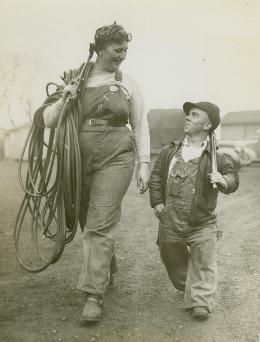 SHIPBUILDING BRINGS BOOM TO EVANSVILLE, 1/29/1944. EVANSVILLE, IND.: Built on waste land, the two year old shipbuilding plant of the Missouri Valley Bridge and Iron Company, has been credited with producing a greater tonnage of ocean-going vessels than any other inland shipyard of the world in the last year, in building the Navy’s Landing Ships for Tanks or LST, to be used on both sides of the world by invasion forces, although being built 1,000 miles from the sea. Photo shows a pair of oddly matched workers, Ruth Nunley, 6 foot, 1 inch tall and weighing 254 pounds, and Johnnie Houston, 4 foot 4 inches tall and only weighing 120 pounds. In spite of the heavy work, and the weather, a great number of women work side by side with men, welding, burning and painting. Credit: ACME