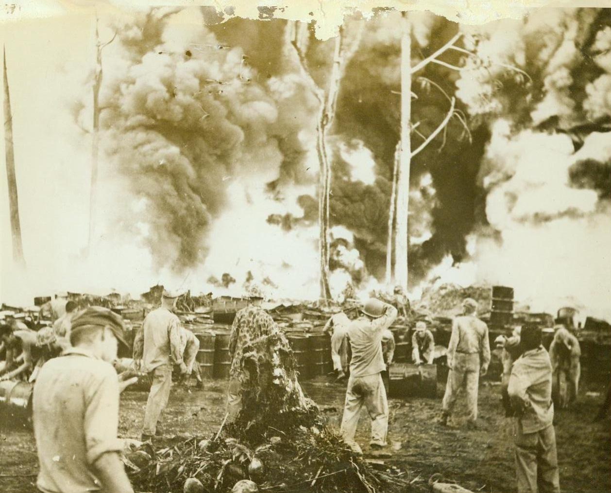 Leathernecks save fuel from Jap bomb fire, 1/11/1944. PURUATA ISLAND – United States Marines roll out unexploded drums of fuel from within 30 feet of hungry pillars of fire, set off by a Jap bomb hit on Puruata Island. Thousands of drums, wet down by hose lines, were saved by the leathernecks fighting in the Bougainville Area. Two heat prostration cases were the only casualties in the “battle” with a flaming enemy. CREDIT (Official U.S. Marine Corps photo – ACME) 1/11/44;