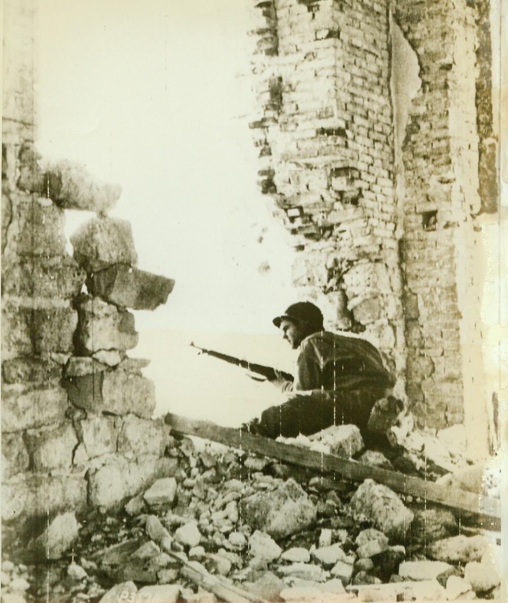 Looking for snipers, 1/11/1944. SAN VITTORE, ITALY – An American soldier peers carefully through a breach in a wall of a blasted building in San Vittore, keeping a sharp watch for German snipers remaining in the town after it was occupied by the Allies. This photo was flashed to the U.S. by radiotelephoto. CREDIT LINE (ACME ) 1-11-44