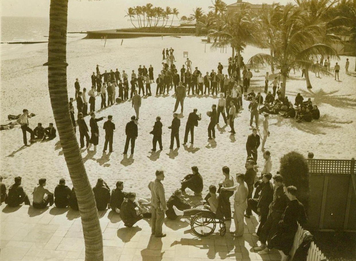 May have to find a new playground, 1/31/1944. PALM BEACH, FLA. – While some soak up sun in wheel chairs and other stretch out on the sand, a group of convalescing soldiers play healthful games on the sand at the Ream General Hospital, onetime Breakers Hotel in Palm Beach. Fighter Buddy Baer, recuperating from a back injury, is in the center of this circle of servicemen who may have to look for another “playground” is the hotel is returned to its owners for commercial use. CREDIT LINE (ACME) 1/31/44;