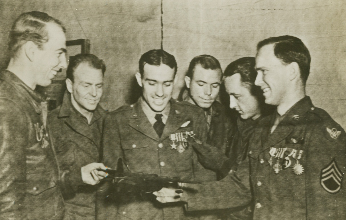 Seven in One Day, 1/31/1944. England – S/Sgt. Oliver R. Germann, 25, of Moran, Wyoming, extreme right, who received seven decorations in one day, the Silver Star, DFC with Oakleaf Cluster, Purple Heart, Airmedal with Three Oakleaf Clusters, holds a wooden model of a bomber given by S/Sgt. M. Hall, of Sanger, California, extreme left. Others watching the little ceremony are, left to right: S/Sgt. F.B. Mellums, of Springfield, Tennessee; S/Sgt. L.L. Ackerman, of Fox, Arkansas; T/Sgt. B.R. Smith, of Insull, Kentucky; S/Sgt. J.A. Crowder, of Luden, Tennessee, and S/Sgt. Oliver Germann. Credit: ACME