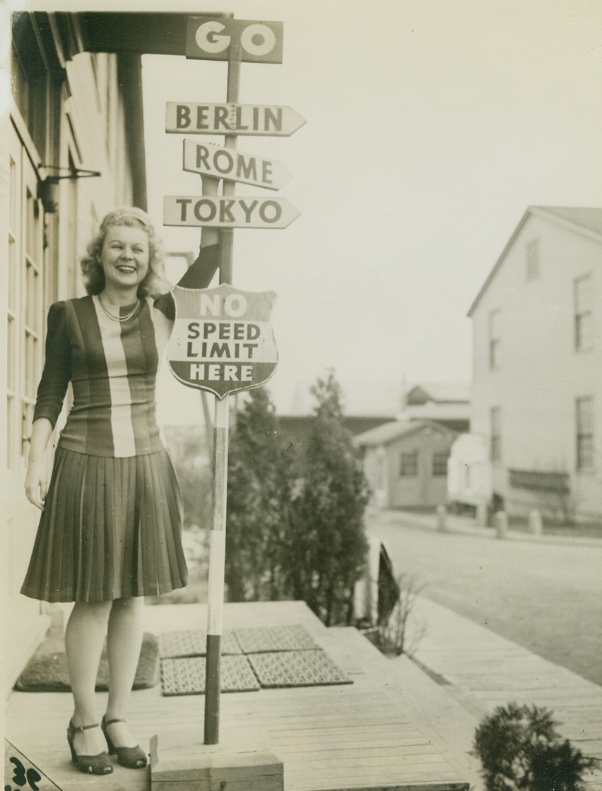 SHIPBUILDING BRINGS BOOM TO EVANSVILLE, 1/29/1944. EVANSVILLE, IND. – Built on waste land, the two year old shipbuilding plant of the Missouri Valley Bridge and Iron Company has been credited with producing a greater tonnage of ocean-going vessels than any other inland shipyard of the world last year, and the Navy has boosted its order to double last year’s quota! The company builds the Navy’s ugly-ducklings, landing ships for tanks, or LST, as they are known in the service. Photo shows Mary Hollencamp, a secretary, with sign outside the yard office reminding the workers where their product is to be used. Credit: ACME