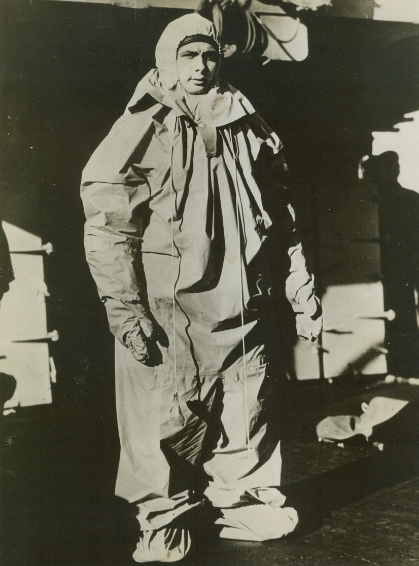 Dressed for an Icy Dunking, 1/6/1944. Recent tests proved that the lightweight exposure suit worn by this PCAF flier will increase the chances of survival of an airman brought down in icy seas. This pilot got a dunking in the Canadian-Atlantic and was able to float comfortably for hours, while his companions who wore only ordinary pilots’ clothing or sheepskin suits had to holler for “rescue” almost immediately. A joint U.S.-Canadian air-sea committee conducted the tests in 40 degree water. Credit: Army Air Force photo from ACME;