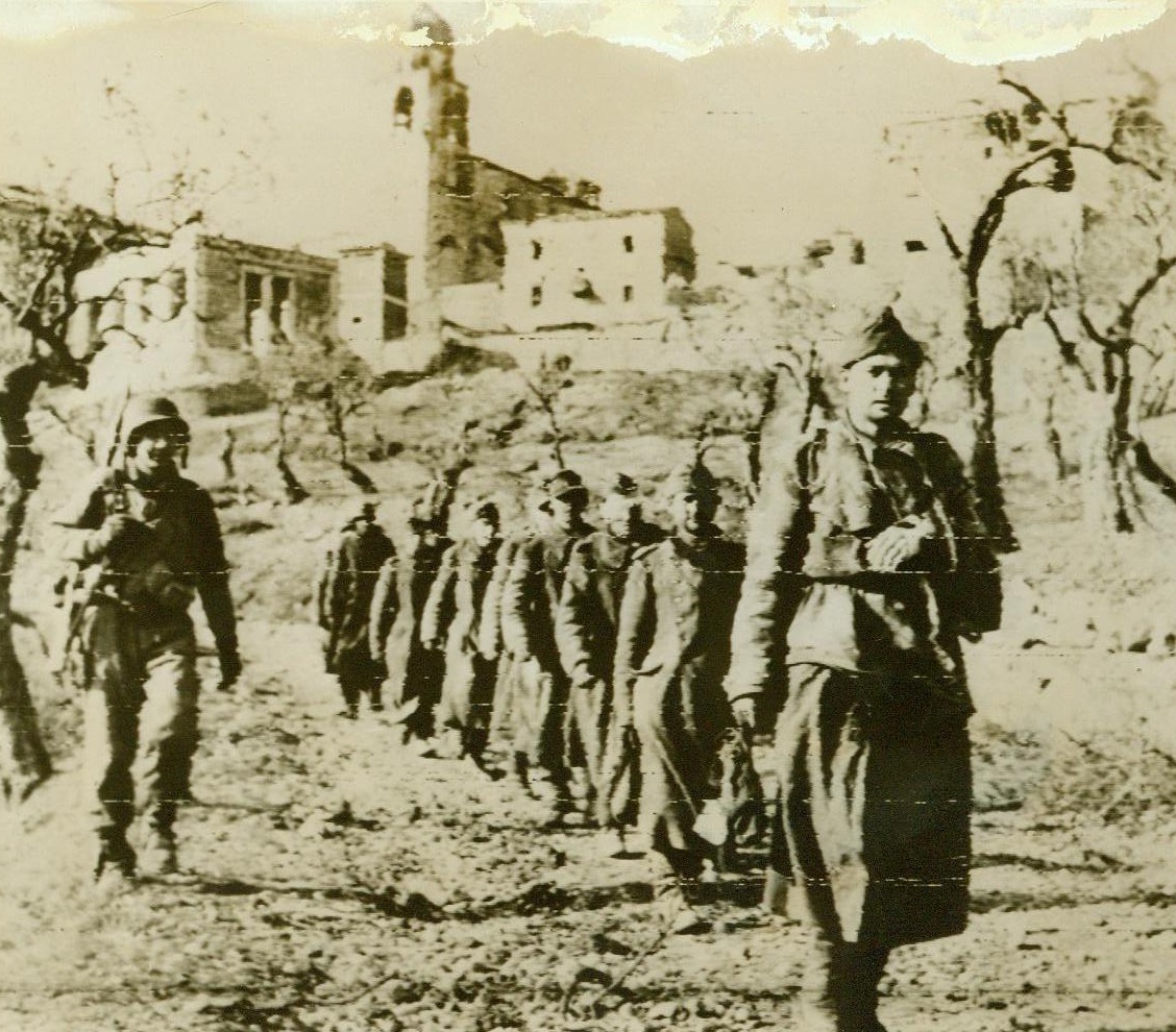 A short war for these Germans, 1/13/1944. MT. PORCHIA, ITALY – Pfc. Ira C. Creed, (left), of Johnson City, Tenn., marches three green recruits of the famous Hermann Goering Nazi Division down the side of Mt. Porchia, after capturing them single-handedly. The prisoners, who admitted they had only a little infantry training, were on duty in the front lines for only one night when he captured them behind a rock. They are shown on their way to a prisoner of war camp. CREDIT LINE (U.S. Signal Corps Radiotelephoto from ACME) 1-13-44