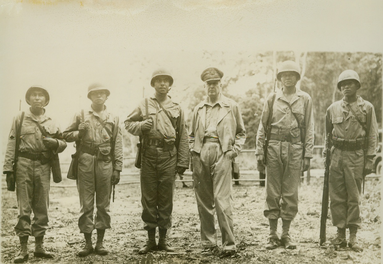 Five Indian Tribesmen Meet a Chief, 1/19/1944. Somewhere in the Southwest Pacific—Gen. Douglas Macarthur, Commander-in-Chief of Allied Forces in the Southwest Pacific, meets representatives of five different American Indian tribes in one U.S. Army unit. S/Sgt. Virgil Brown (Pima), Phoenix, Ariz.; Sgt. Virgil F. Howell (Pawnee), Pawnee, Okla.; S/Sgt Alvin J. Viloan (Chitmatcha), Charenton, LA.; General Macarthur; Sgt. Byron L. Tsignine (Navajo), Ft. Defiance, Ariz.; Sgt. Larry L. Dekin (Navajo), Copper Mine Ariz. (U.S. Signal Corps Photo).;