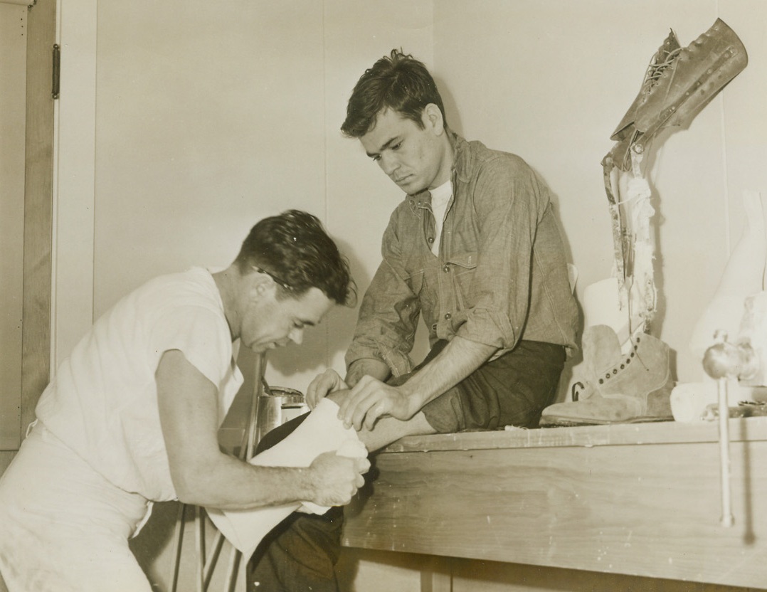 New Leg for Crippled Veteran, 1/20/1944.Mare Island, Calif. – S.C. Blankenship, ship cock 3/C of Alum Creek, Va., tries out his new, temporary artificial leg, watched by Matt Lawrence, in charge of the artificial limb department at the Mare Island, Calif., U.S. Naval Hospital. A plastic and steel limb will replace this temporary one, fitted to Blankenship barely six weeks after he lost his own leg from action on Vella Lavella. Credit: (ACME)