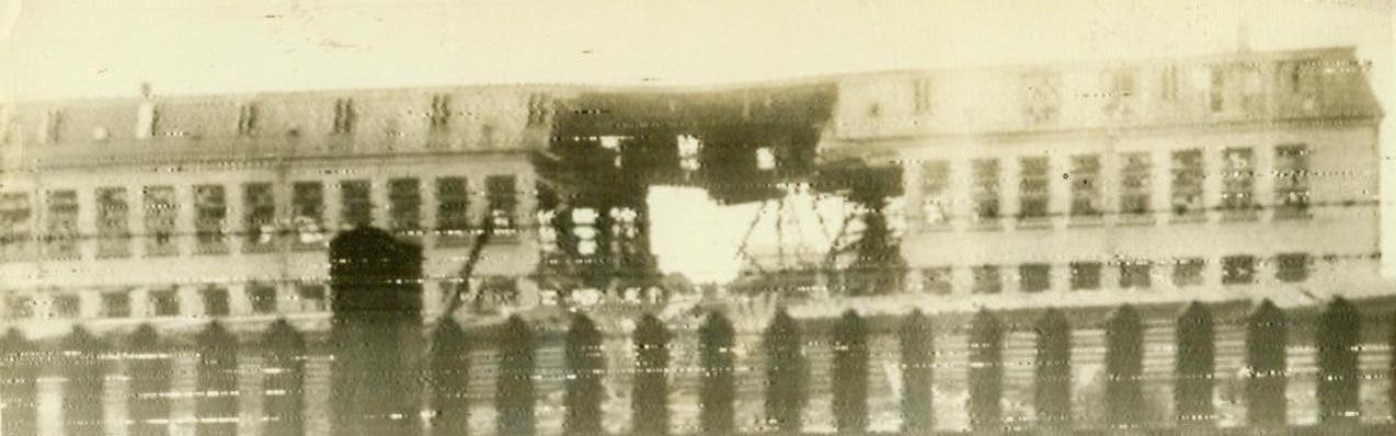 DANES SABOTAGE NAZI MACHINE SHOP, 1/20/1944. COPENHAGEN – Rebellious Danish workers slipped one over on their Nazi factory guards, and blasted out a large section of the Pindstoftes Machine Shop in Copenhagen. The three upper stories appear to be blasted out, in this photo passed by German censorship. Credit (ACME Radiophoto)
