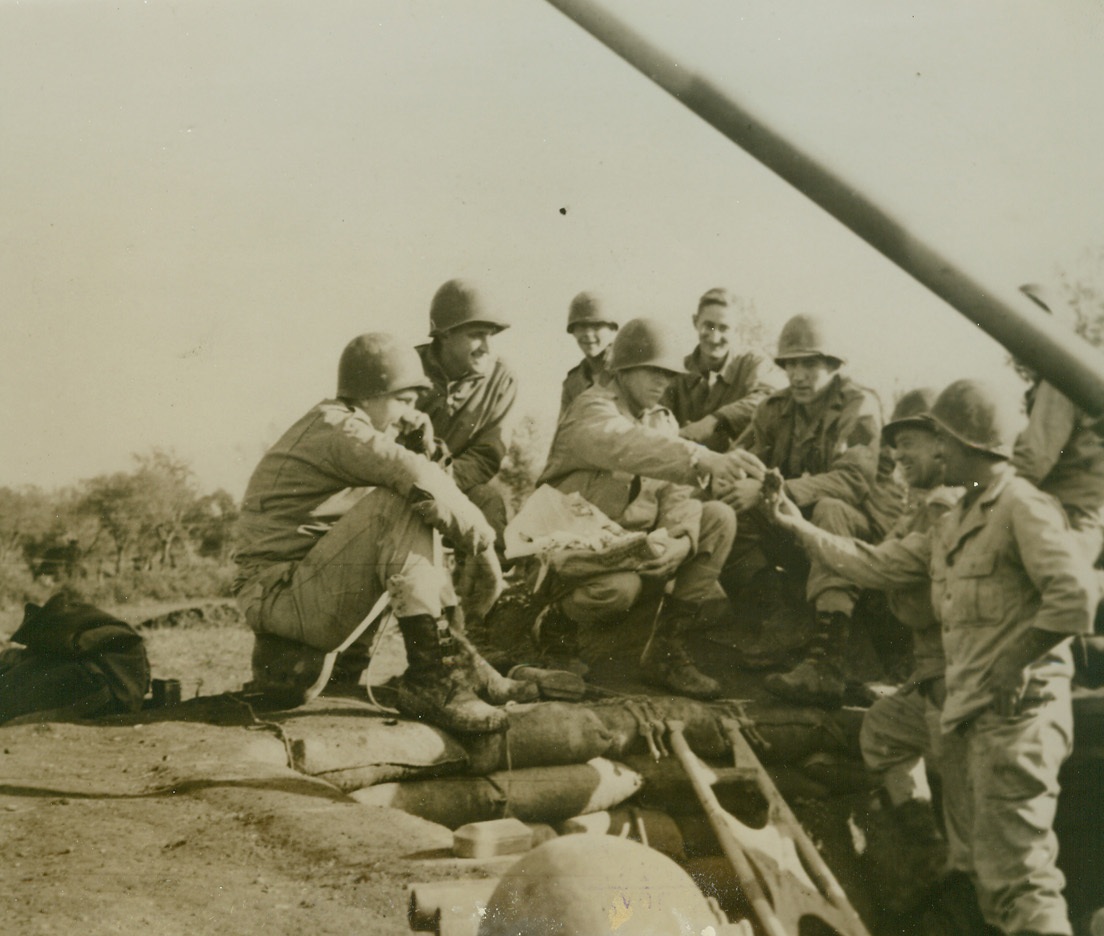 Sharing His Luck, 1/5/1944. ON THE ITALIAN FRONT — Pfc. Paul Sugalski of Glen Lyon, Pa., shares a Christmas fruit cake, fresh out of the mail bag, with his U.S. Fifth Army buddies. Left to right: Pfc. Walter Samerdek, Central Falls, R.I.; Cpl. Walter Hammer, Brooklyn, NY; Pfc. George Denmeade of Struthers, Ohio; Pfc. Sugalski; Pfc. Arthur Smith, Providence, R.I.; Sgt. Jeff D. Dermid, Jr., Asheville, N.C.; Pvt. Leonard Hickey, Glen Falls, NY; Pfc. Vincent Cavallario, Watertown, N.Y.; and partly hidden by the gun at far right, Clead Fitzpatrick of Ganado, Texas. Credit: ACME;