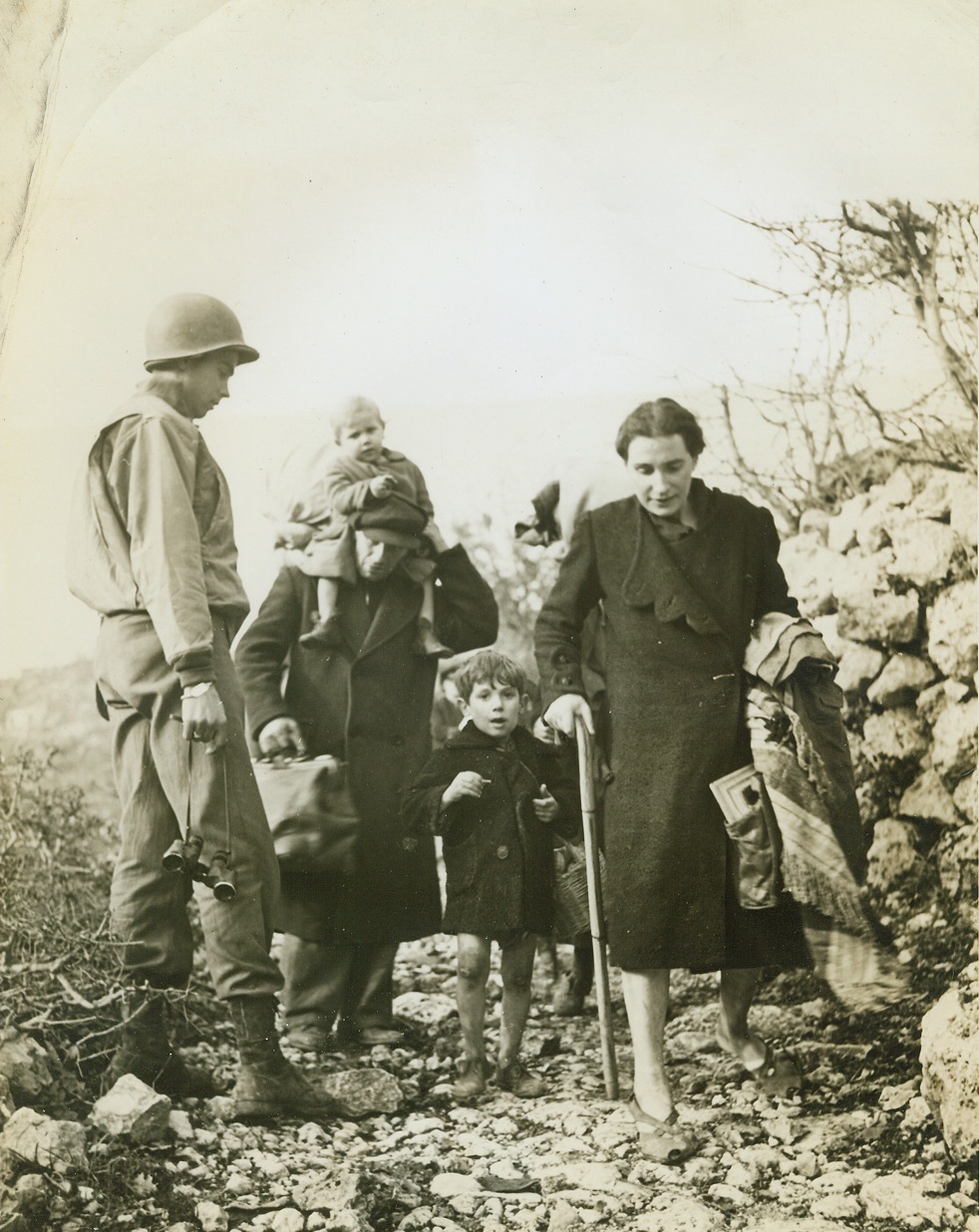 Return of the Natives, 1/1/1944. LAGONE, ITALY – Scene of many days of bitter fighting, the tiny mountain town of LaGone fell to warriors of Lt. Gen. Mark Clark’s Fifth Army, and the smoke of battle hardly cleared before hundreds of natives flocked down from the hills to return to their homes. The pathos of their tragic homecoming to the wrecked, blasted building is recorded in this series, made by Acme correspondent Bert Brandt for the War Picture Pool. Non-combatants all these men, women and children find that war is a very personal experience nevertheless: an experience that has left them with a deep, grim hatred for the Germans.New York BureauA tiny tot rides atop his father’s shoulders, and his mother walks with a cane as this family returns from the hills. At left is Lt. Harry McKinnon of Charlotte, N.C., who is in charge of a group of combat engineers.;