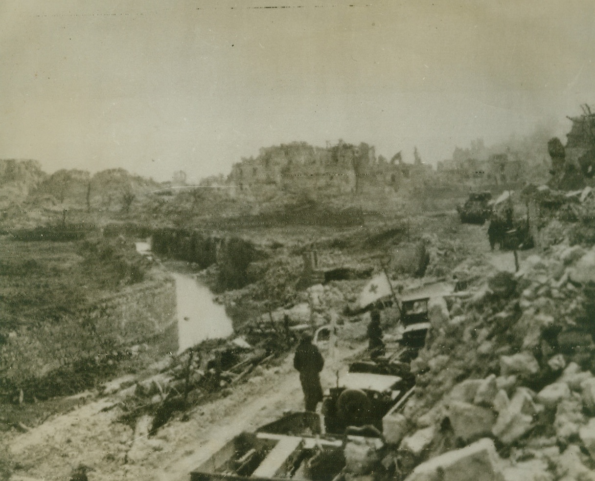 ENTERING “CITY OF THE DEAD, 3/20/1944. This photo, flashed to the U.S. by radio today, shows a long line of Red Cross and patrol vehicles, pausing behind the shelter of piles of rubble, just before entering Cassino, Italy, following the Allied “obliteration raid”—heaviest of the war—on the town. German paratroops, landed after the raid, put up stubborn resistance, but today, all but a section of the southern part of Cassino was in Allied hands. Note ruined buildings (background in photo) marking the terrific destruction wreaked by Allied bombs.Credit: U.S. Signal Corps radiophoto from Acme;