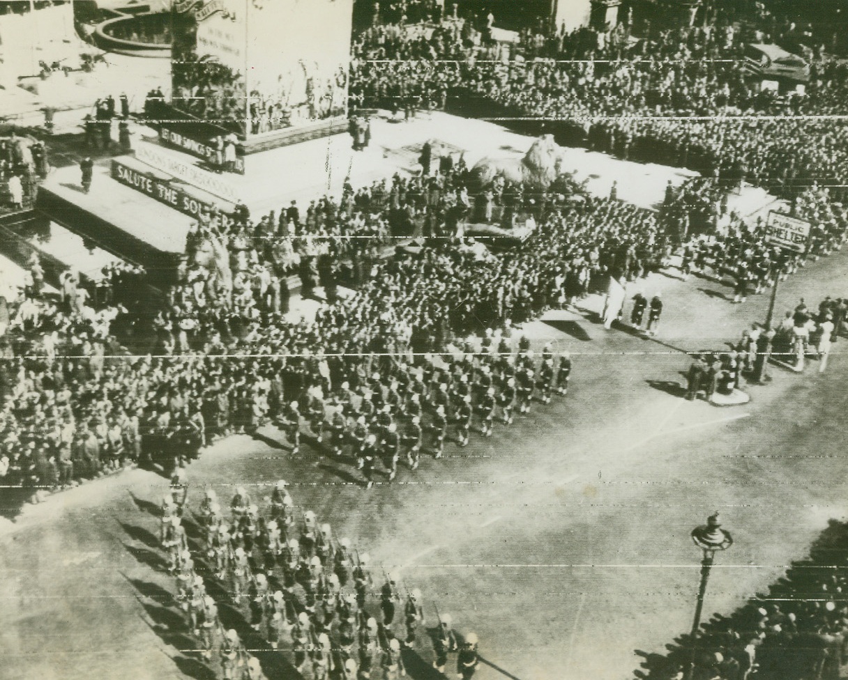 YANKS PARADE IN TRAFALGAR SQUARE, 3/30/1944. LONDON – Marching in the great parade to boost Britain’s current war bond drive today (March 30th), American warriors tramp past the reviewing stand in London’s Trafalgar Square. American soldiers, WACs and mechanized equipment were in the parade, with men of the U.S. Army Air Forces getting the biggest hand as they marched by. Photo radioed from London.Credit: Acme;