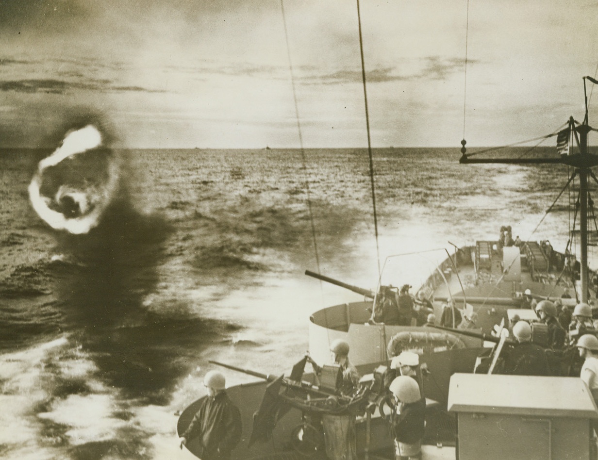 Headed For Disaster, 3/23/1944. Its after-section seemingly severed as a white comber roars over it scuppers, a damaged Japanese destroyer of the Asashio class vainly maneuvers in an attempt to escape the attack of a U.S. Navy Grumman Avenger (top, left), during the raid on Truk, last Feb. 16. A short time later, the Nip warship joined the growing number of her sister ships at the bottom of the Pacific. Credit line (U.S. Navy photo from ACME);
