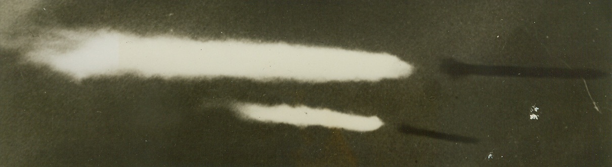 ZOOMING ACK-ACK, 3/12/1944. SOMEWHERE IN ENGLAND—Many Nazi raiders who never lived to tell the tale met their death in the roaring flame of Britain’s new “Z-gun.” Anti-aircraft rockets that roar ominously as they zoom upward, this new “ack-ack” explodes in large and vivid flashes as it tangles with Luftwaffe planes. Details of the construction and operation of the “Z-guns” are still secret, but they have already accounted for many lost Nazi planes in raids over England. The rocket projectiles are shown as they climbed through the skies during a night raid. Credit Line (ACME);
