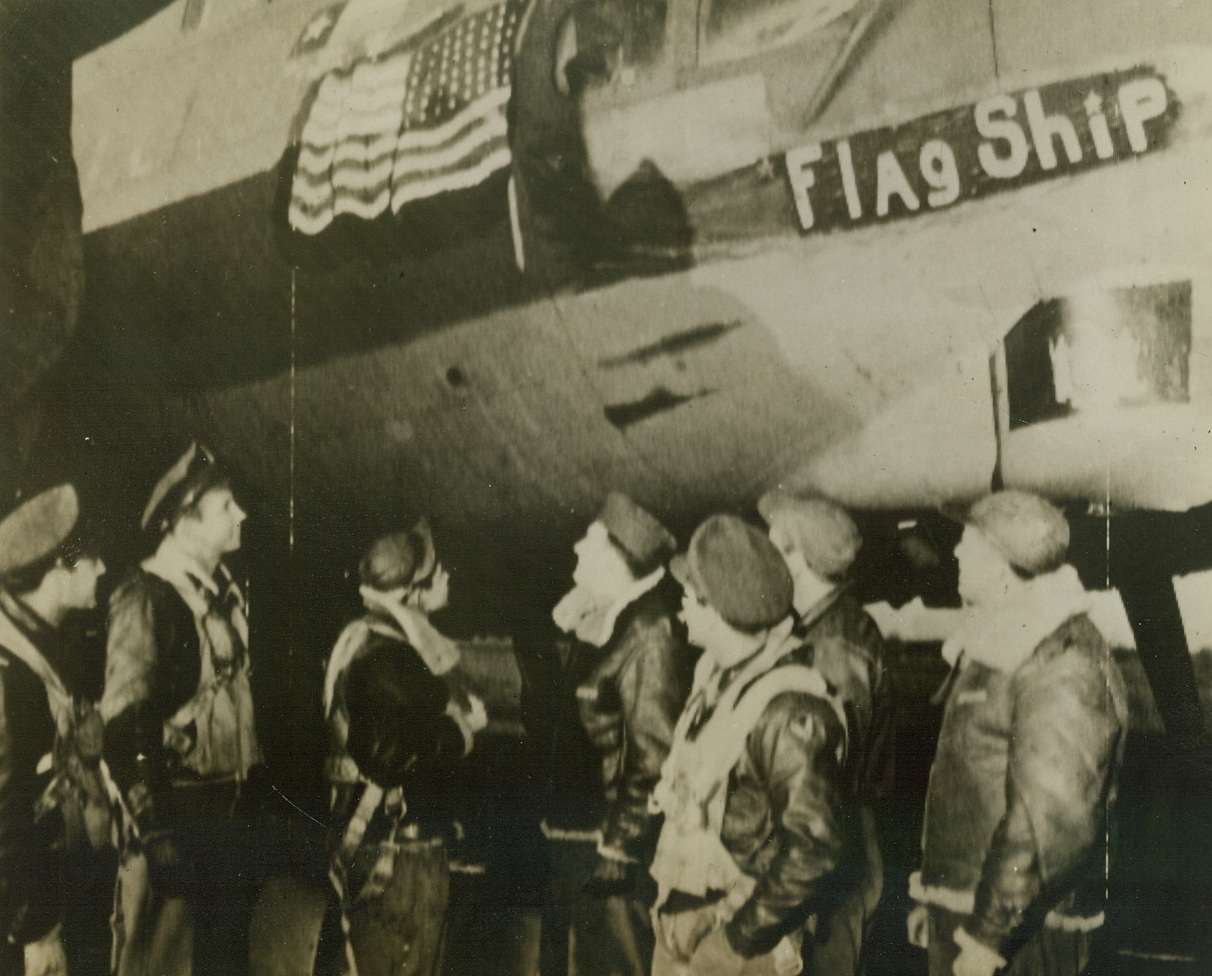 First U.S. Flag Over Berlin, 3/13/1944. Britain – Crew members of the Flying Fortress “Flagship” gaze at the Stars and Stripes painted on the side of their ship after their return to their base “somewhere in Britain,” from the first American daylight raid on Berlin. The flag on the plane’s fuselage was, therefore, the first flag to fly over the German capitol. Left to right are: Lt. William Matetich, of Koppel, Pennsylvania; Lt. Preston M. Dean, Hartsville, South Carolina; T/Sgt. Adolph A. Alvarez, Corpus Christi, Texas; S/Sgt. L.W. Bedey (CQ), of New York City; Lt. A.D. Wolfe, Richmond Hill Long Island, New York; S/Sgt. Thomas Cook, Pittsburgh, Pennsylvania; and S/Sgt. W. Pickup, of Camden, New Jersey. Credit: U.S. Signal Corps Radiotelephoto from ACME;
