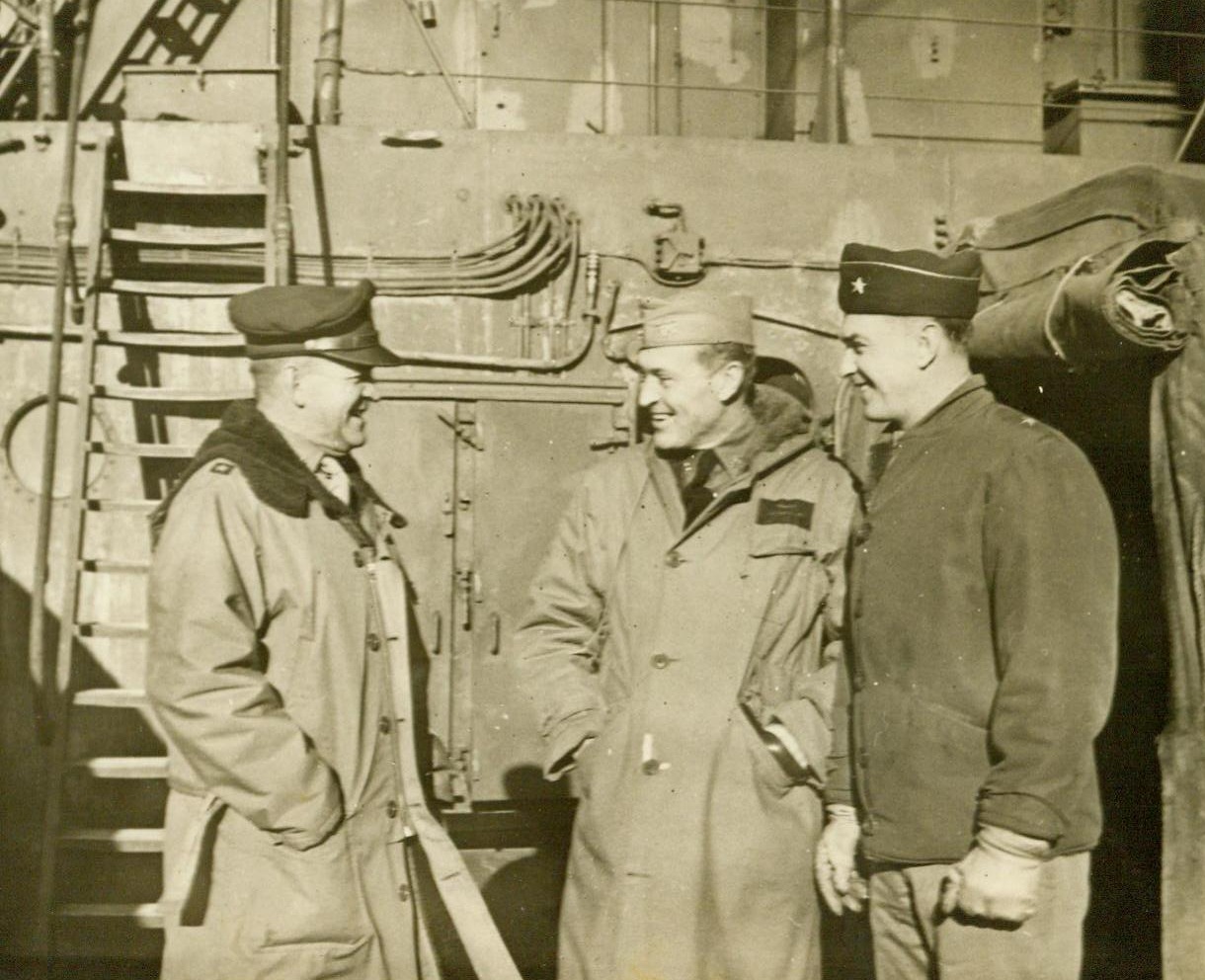 Task Force Commander and Observers, 3/2/1944. Somewhere in the Pacific— Aboard the flagship of a U.S. Naval task force which bombarded Paramushiro, Nipponese Kurile Islands Naval Base, early last February, are (LtR): Maj. Gen. Davenport Johnson, Commander with USAAF, based in Alaska; Rear Adm. Wilder D. Baker, Task Force Commander; And Brig. Gen. E. D. Post, Chief of Staff, Army Alaska Department. The two Army officers accompanied the force as observers. 3/2/44 (ACME);