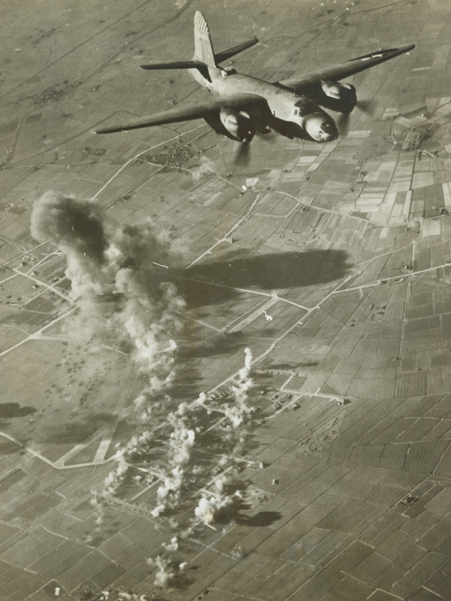 NAZI AIRDROME GETS A SCIENTIFIC MAULING, 3/9/1944. LEEUWARDEN, HOLLAND—Her bomb-bay doors wide open, a B-26 marauder roars over a Nazi airdrome at Leeuwarden, Holland where three paths of bombs cut squarely through a large dispersal area containing numerous aircraft shelters. A concentration of bombs has hit a fuel dump at the other end of the German base while at the extreme left a shadow cast by smoke rises from still another dispersal area (not shown in photo). The Ninth Air force medium bombers are continuing to give enemy airdromes in western Europe a scientific pounding.Credit: Acme;