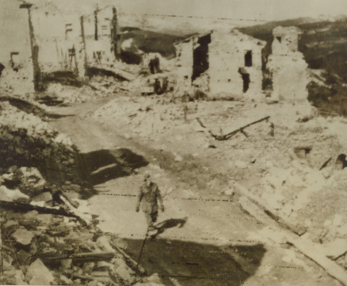 GERMANS LEAVE DESTRUCTION IN THEIR WAKE, 3/27/1944. ITALY—All that remains of this Italian city, San Pietro are ruins and destruction by the Germans shortly before their retreat from the city. An English tommy is walking among the wreckage.Credit: Acme;