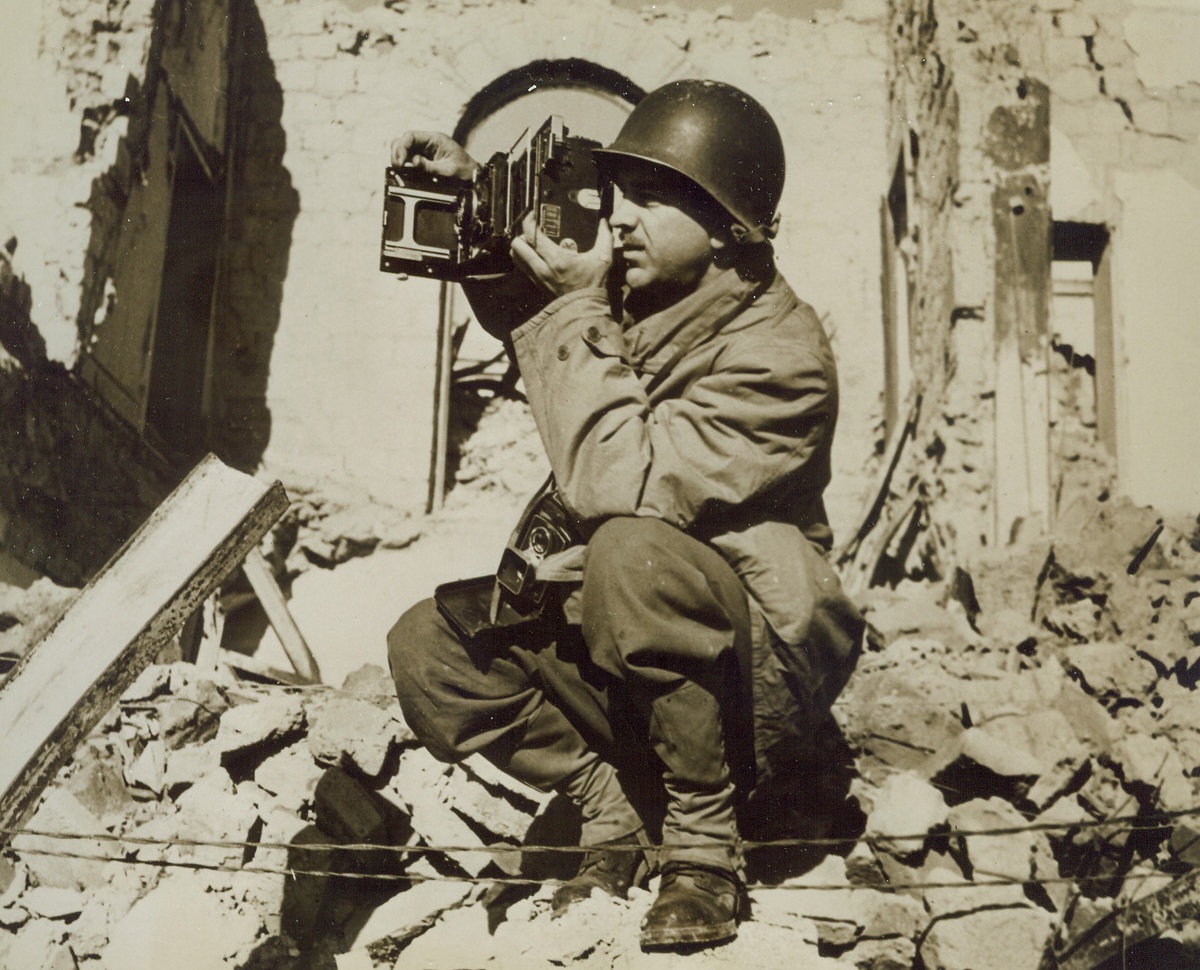 Get That Picture!, 3/3/1944. NETTUNO, ITALY – Squatting on a pile of bomb-debris, Charlie Seawood, Acme Newspictures photographer for the war picture pool, is ready to make a picture of the bomb ruins of battle-scarred Nettuno. Credit Line – WP – (Acme)A;
