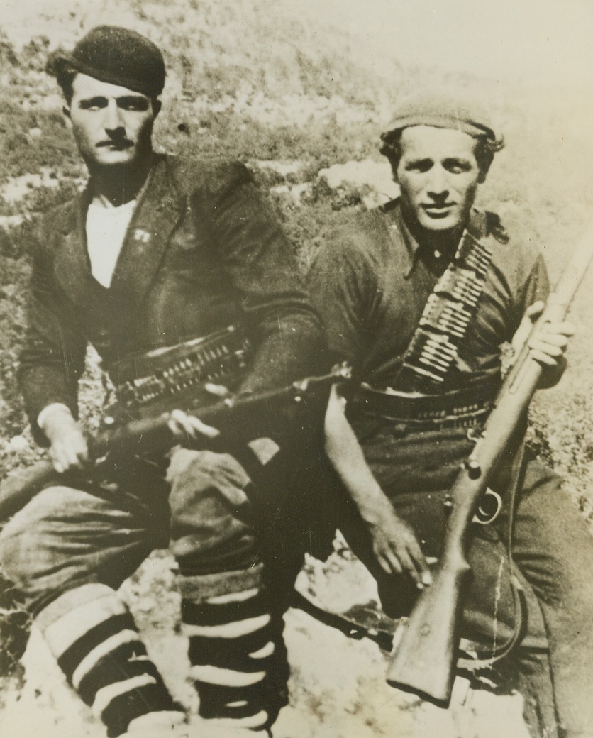 “Freedom, Or Death!” – The Andartes’ Credo, 3/29/1944. GREECE – High in the mountains of Greece a storm of vengeance is gathering over the heads of Nazi occupation troops that are despoiling once happy land, and starving, terrorizing and murdering its people. This “storm” is the growing band of Greek patriots, the Andartes, who are training and plotting for the day of liberation. Even now, “lightening” strikes at German outposts in the form of sharp, deadly Andarte raids, and railway trains and bridges have been blown to bits by these grim, hardy guerillas. Every day, harassed Greek civilians find escape from the “New Order” in the mountain retreats of the Andartes, bringing with them their meagre belongings and new tales of Nazi terrorism. The Andartes have sworn that someday, soon, Greece will be free again. The only alternative to their vow, is death. In this series of photos, just released in New York by the Greek Office of Information, activities of the Andartes are shown. Two fighters of the Ardartes armed with efficient-looking rifles, and wearing makeshift uniforms, are seated atop a rock high in the mountains of Greece.;