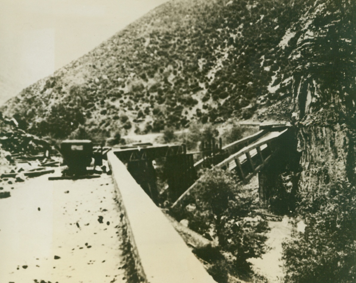 FREEDOM, OR DEATH!”—THE ANDARTES’ CREDO, 3/29/1944. GREECE—High in the mountains of Greece a storm of vengeance is gathering over the heads of Nazi occupation troops that are despoiling this once happy land, and staving, terrorizing and murdering its people. This “storm” is the growing band of Greek patriots, the Andartes, who are training and plotting for the day of Liberation. Even now, “lightning” strikes at German outposts in the form of sharp, deadly Andarte raids, and railway trains and bridges have been blown to bits by these grim, hardy guerillas. Every day, harassed Greek civilians find escape from the “New Order” in the mountain retreats of the Andartes, bringing with them their meager belongings and new tales of Nazi terrorism. The Andartes have sworn that someday, soon, Greece will be free again. The only alternative to their vow, is death. In this series of photos, just released in New York by the Greek Office of Information, activities of the Andartes are shown. NEW YORK BUREAU EVIDENCE OF ANDARTE ACTIVITY—Here a bridge along a mountain raod in Thessaly has been blown up, blocking the movement of supplies and reinforcements to Nazi mountain outposts. Credit: Acm;