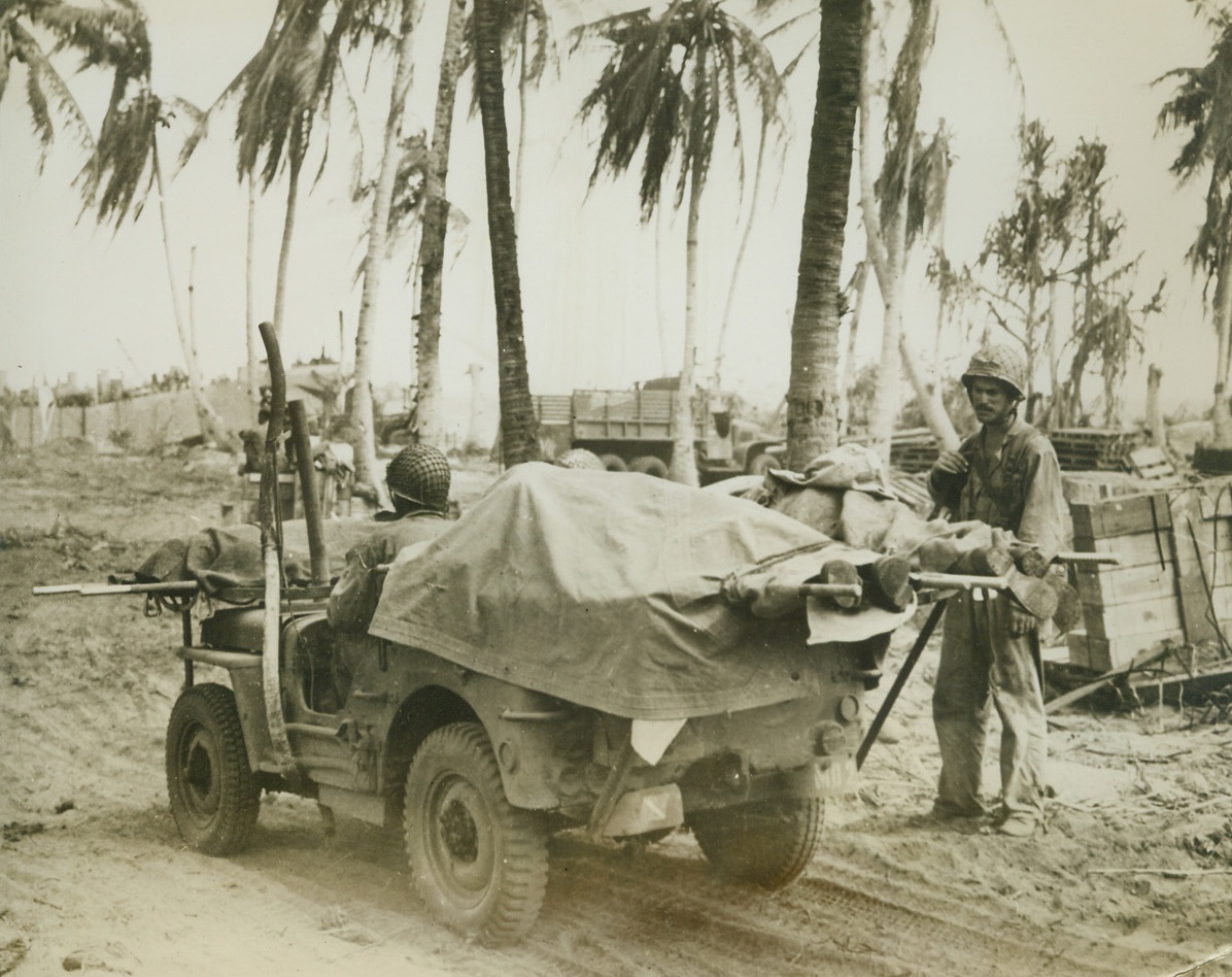 JEEP SERVES AS A HEARSE, TOO, 3/6/1944. ENIWETOK ISLAND—The versatile Jeep takes on a grim task on Eniwetok Island. Covered by a tarpaulin, bodies of American dead are carried away for burial on the island. Soldier at right sadly watches as his buddies take their last ride. Credit Line (ACME);