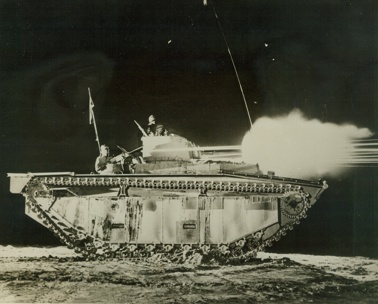 New “Water Buffalo” Packs a Wallop, 3/9/1944. WASHINGTON, D.C.– In this photo, released by the Navy Department in Washington today, the 37mm. cannon and two 50cal. machine guns of a new LVT (A)-1 amphibious tank fire in unison to send streams of steel out over the test firing range. Illuminating the “Water Buffalo” with the glare. The new hard-hitting tank, similar to its predecessors except that it has its 37mm. cannon mounted in a turret, has already played an important role in the invasion of Jap strongholds in the Pacific. The vehicle, through its ability to travel with ease in water or on land, is a valuable invasion asset. Credit: (Official U.S. Navy Photo from ACME);