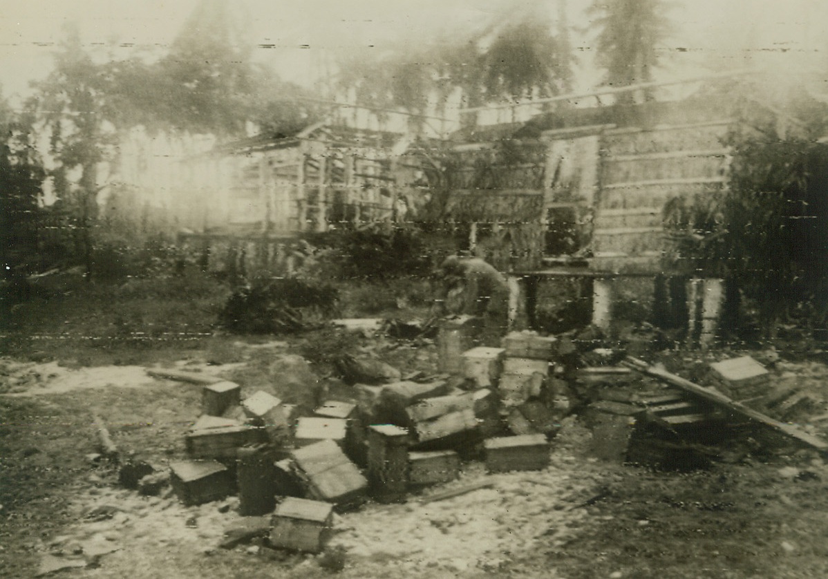 Checking Yank Supplies on Los Negros, 3/2/1944. Los Negros Island – Two members of the First U.S. Cavalry Division check supplies on the beach at Los Negros, after the American landing on this island of the Admiralty group. In the background can be seen Jap grass huts and supply dumps, wrecked by the pre-invasion air and sea bombardment. Photo was taken during a heavy rain by Acme photographer Tom Shafer. Gen. MacArthur, who personally directed the invasion Feb. 29, from the bridge of a ship of the Task Force, announced today that the Admiralty Invasion had been planned merely as a reconnaissance in force, but when it was discovered how completely the Japs were taken by surprise, the move was turned into a complete occupation. Credit: ACME photo by Tom Shafer for the War Picture Pool via Signal Corps Radiophoto;