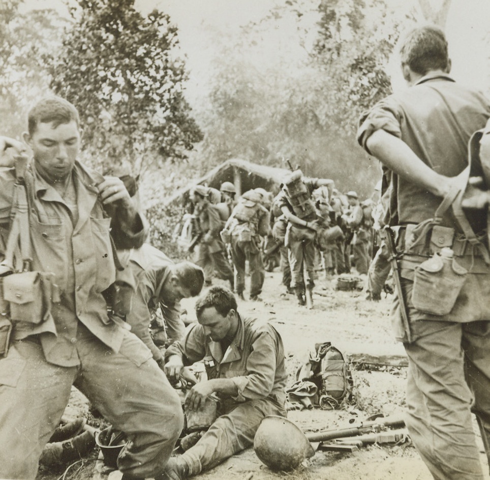 A Brief Rest for the Weary, 3/31/1944. Northern Burma – Battle-weary Yanks rest during a brief meal period in a deserted Kachin Village in the Hukawng Valley, Northern Burma. The troops have just returned from four days continuous fighting in the front lines. They are members of Gen. “Joe” Stilwell’s American and U.S. trained Chinese forces, who are successfully driving out the Japs from Northern Burma. Credit: ACME;