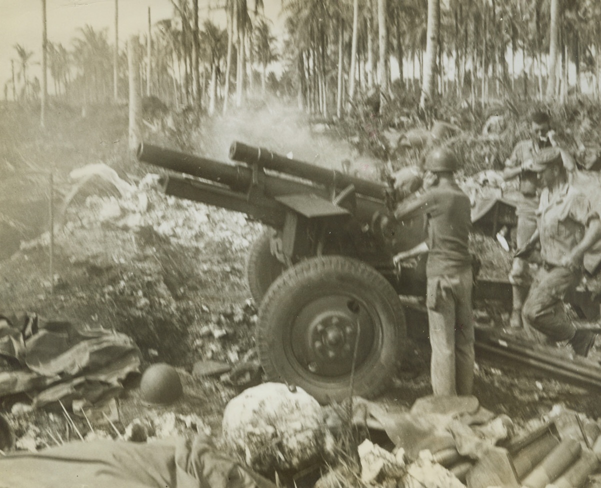 Cleaning ‘Em Up, 3/23/1944. Los Negros, Admiralty Islands – An Allied 150mm gun dishes out plenty of trouble for Japanese troops remaining on Los Negros Island after Yanks had conquered most of the isle. The gun station is in the heart of a battered coconut grove that was blasted by air and sea forces before ground troops landed. Credit: ACME photo by Frank Prist, Jr., for the War Picture Pool;