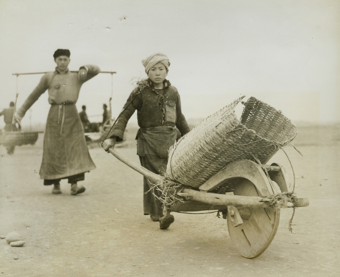 Airfield—Handmade, 3/31/1944. Lack of modern equipment and machinery isn’t stopping the resourceful from building modern airfields in China. Three hundred thousand Chinese workers have been conscripted to do the job. A hundred thousand little handmade wheelbarrows are used to transport materials—and even the chipping of stones for the runways is done by hand. American engineers working in conjunction with expert Chinese army engineers are supervising the job. Photo shows: a young Chinese boy carries essential materials to a runway, using a wheelbarrow constructed of bamboo and wood to carry his load.Credit: ACME Photo by Frank Cancellare for the war picture pool.;