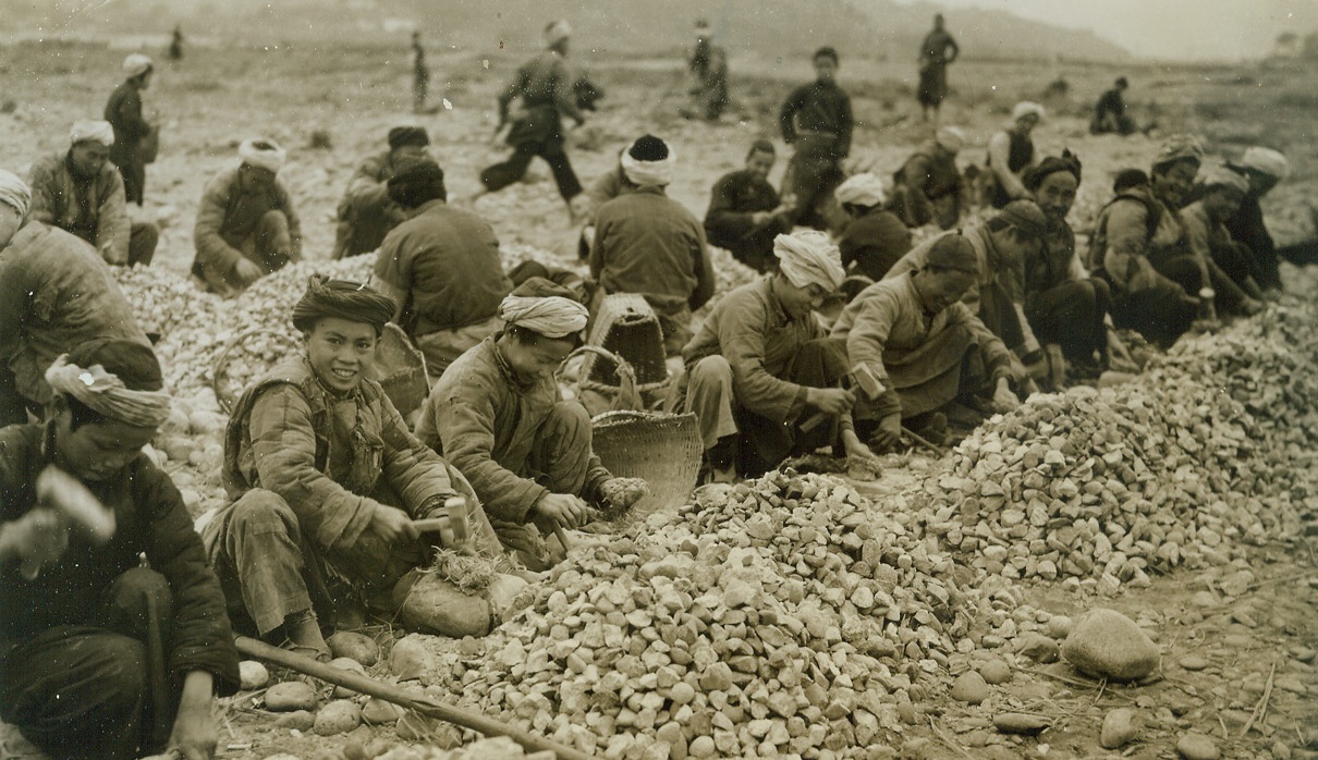 Airfield – Handmade, 3/31/1944. China – Lack of modern equipment and machinery isn’t stopping resourceful Chinese from building modern airfields in China. Three hundred thousand Chinese workers have been conscripted to do the job. A hundred thousand little handmade wheelbarrows are used to transport materials – and even the chipping of stones for the runways is done by hand. American Engineers, working in conjunction with expert Chinese Army Engineers, are supervising the job. Photo shows: A formation of Chinese workers busily chips the stones for the runway by hand.Credit: ACME photo by Frank Cancellare for the War Picture Pool;