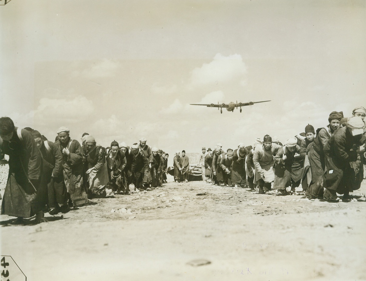 Airfield — Handmade, 3/31/1944. China – Lack of modern equipment and machinery isn’t stopping the resourceful Chinese from building modern airfields in China. Three hundred thousand Chinese workers have been conscripted to do the job. A hundred thousand little handmade wheelbarrows are used to transport materials – and even the chipping of stones for the runways is done by hand. American engineers, working in conjunction with expert Chinese Army Engineers, are supervising the job. Photo shows: drawing a sharp contrast between modern machinery and medieval labor, this Liberator boars over a group of coolies as they strain at the back-breaking job of hauling a huge stone roller over the runway. Credit line(ACME photo by Frank Cancellare for the War Picture Pool) – WP;