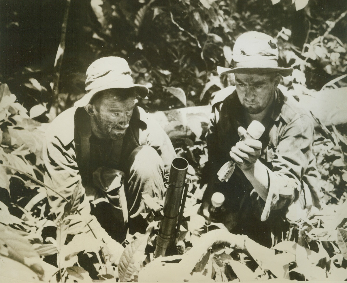Jap-Busting on Green Island, 3/13/1944. Solomon Island – Two New Zealanders, Fred Mazengarb (left), of Gisborne, N.Z.; and William Elmiger, of Tearoha, N.Z. get ready to lob a deadly mortar shell at the Japs on Green Island, after allied forces had landed on the island just North of Bougainville, last Feb. 16th. Credit line (U.S. Navy official photo from ACME);