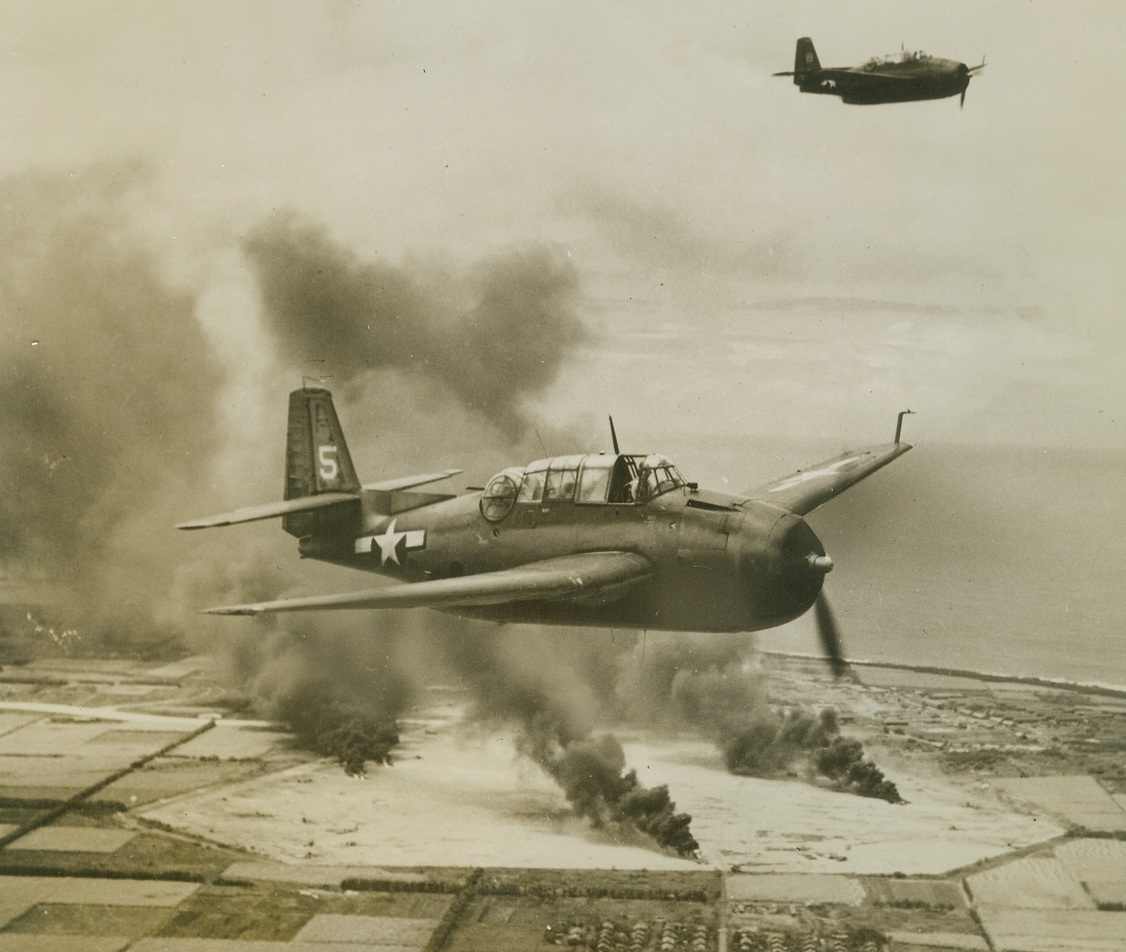 Navy Planes Blast Mariana Island, 3/7/1944. Tinian Island – Huge pillars of smoke rise from direct hits on Jap planes and supplies scored by Navy carrier-based dive bombers during a raid on Tinian island in the Marianas. One of the planes which blasted the Japs (left) soars above the orderly squares of the sugar cane fields adjoining the enemy airstrip. Credit line (ACME);