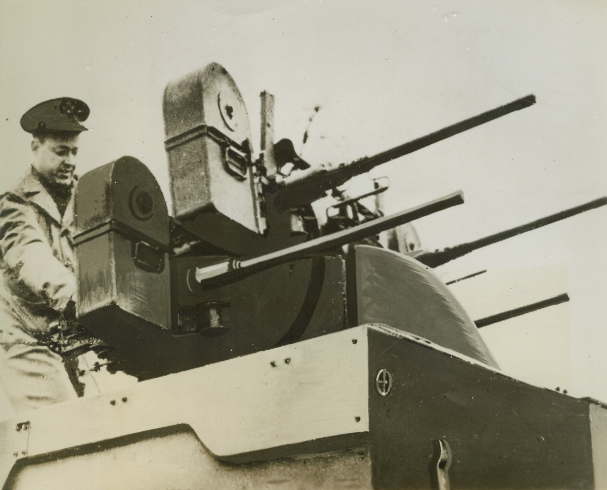 New “Wasp Wagon” Carries a Sting, 3/20/1944. An American soldiers fires the guns on one of the Army’s new mobile anti-aircraft weapon—a half-truck mounting four 50-calibre machine guns. The guns swing together to cover a wide arc of the sky, as well as along the ground. Credit: Official OWI radiophoto from ACME.;