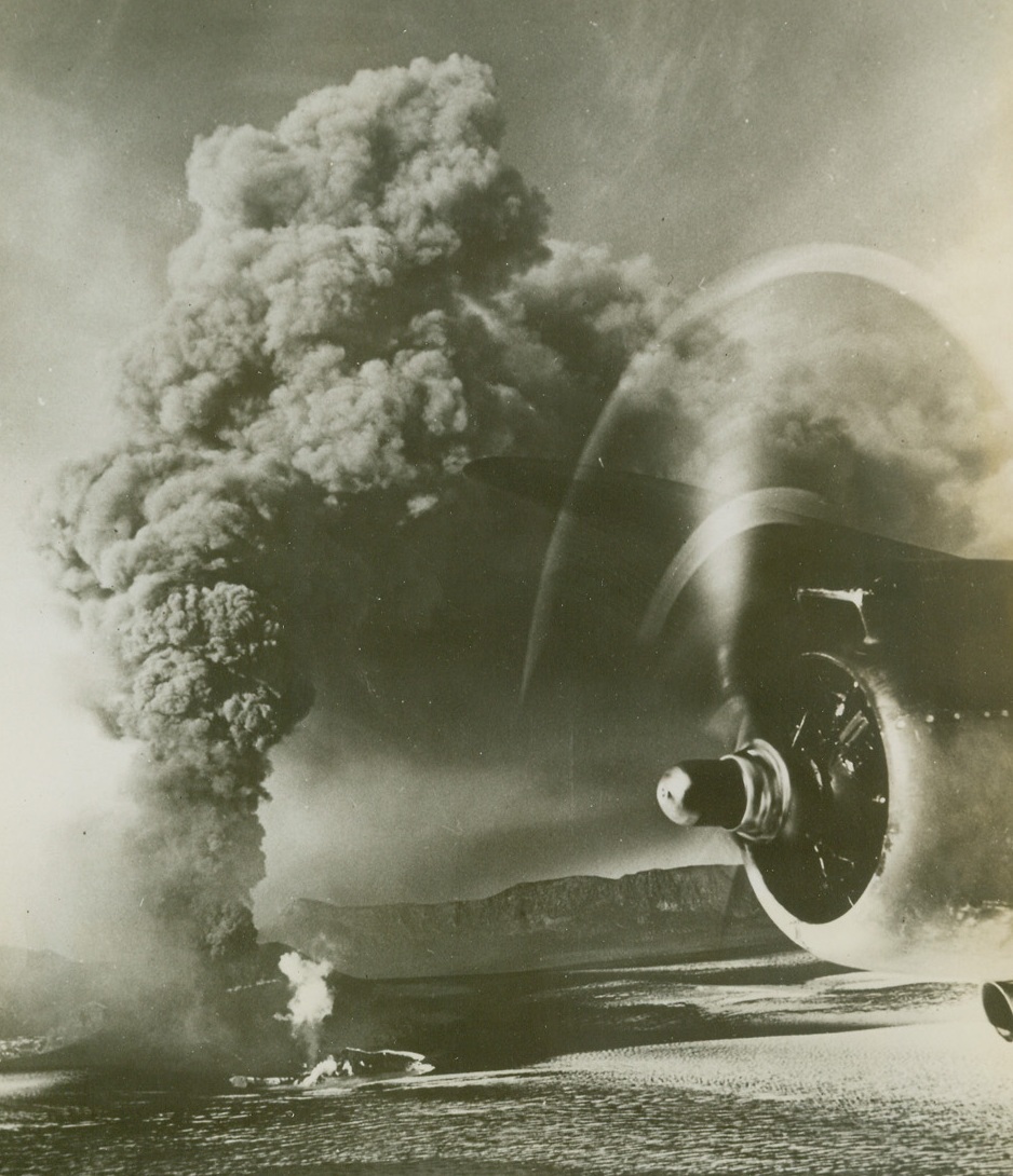 Bomb Athens Harbor, 3/31/1944. ATHENS, GREECE—Clouds of smoke rise from the bomb-battered dock area of Athens, one of the vital German supply centers in the Eastern Mediterranean, after a raid by B-17’s of the U.S. 15th Air Force. German-held airfields near Athens are often the target of raiding American bombers, whose “eggs” are aimed at knocking out Nazi communications in war-torn Greece. Credit: U.S. ARMY AIR FORCES PHOTO from ACME.;