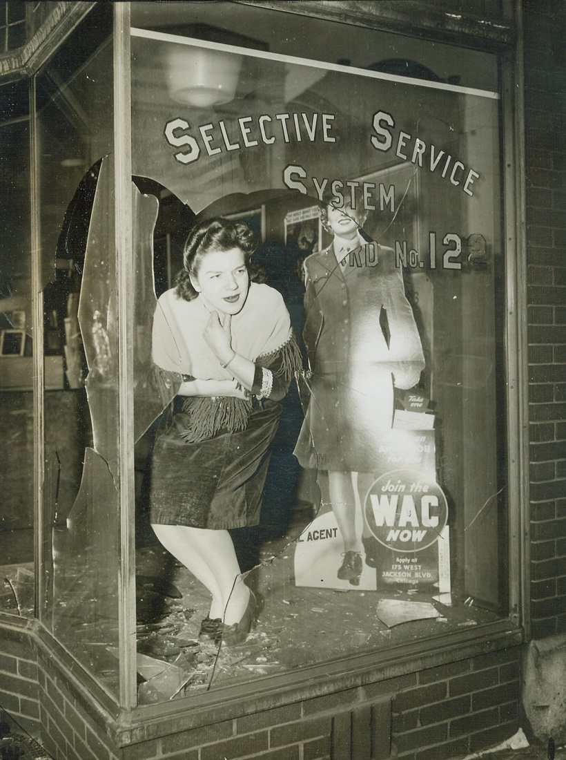 Draft Office Smashed, 3/8/1944.Chicago – Six huge plate glass windows and a glass door of the office of Selective Service Board No. 122 in Chicago were smashed by an early morning marauder whom neighbors reported drove a plant through the glass. Officials blamed this, the second attack, on “discontented people who don’t want to go into service or see their friends go.” Here, Theresa Munari, a draft board clerk, inspects the damage. Credit: ACME;