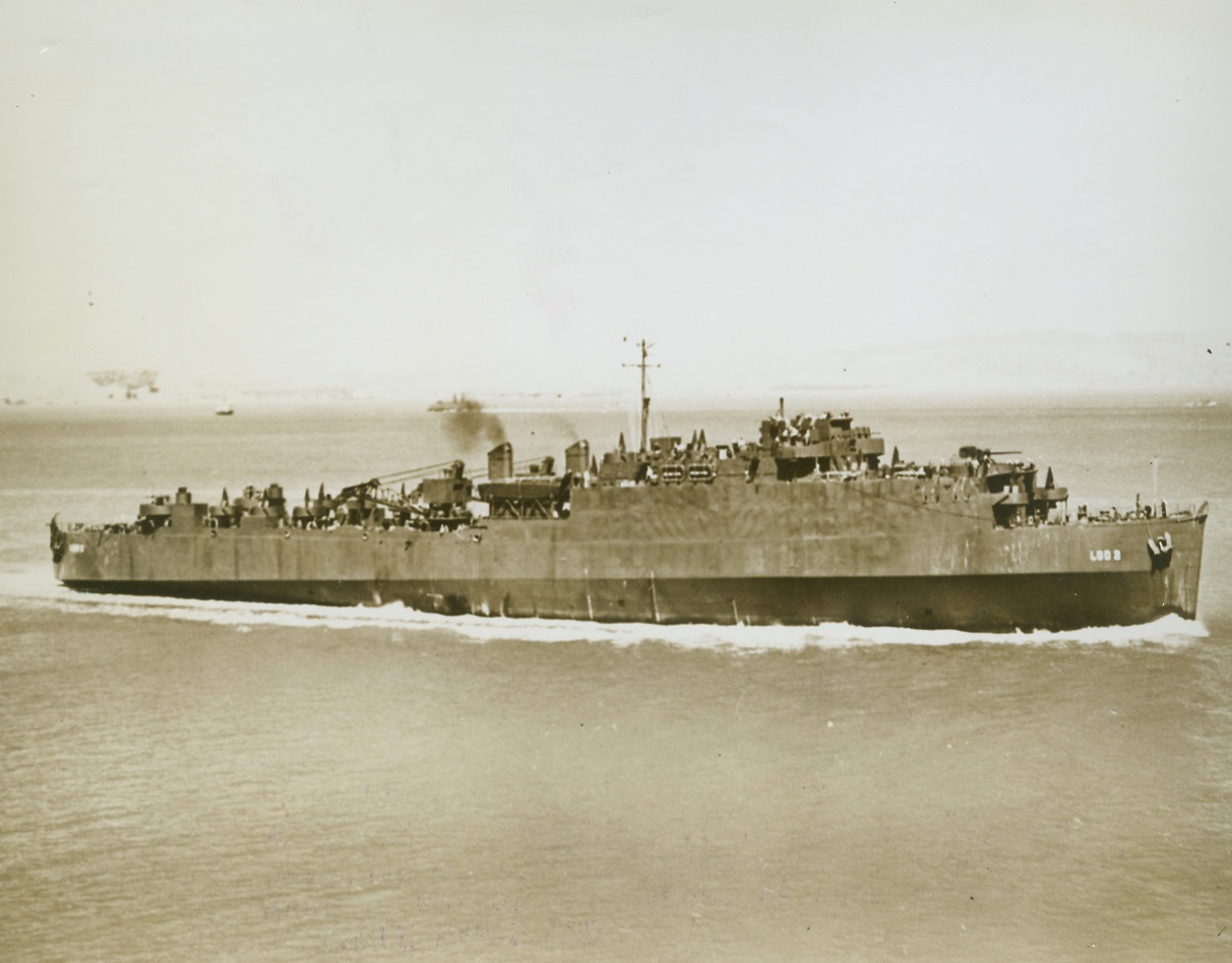 Uncle Sam’s LSD, 3/28/1944. Here is one of the larger vessels in the American Navy’s fast-growing amphibious fleet. An ocean-going craft, it is an LSD (Landing ship, dock), scheduled to play an important role in Uncle Sam’s future invasions. Credit: Official U.S. Navy photo from ACME.;
