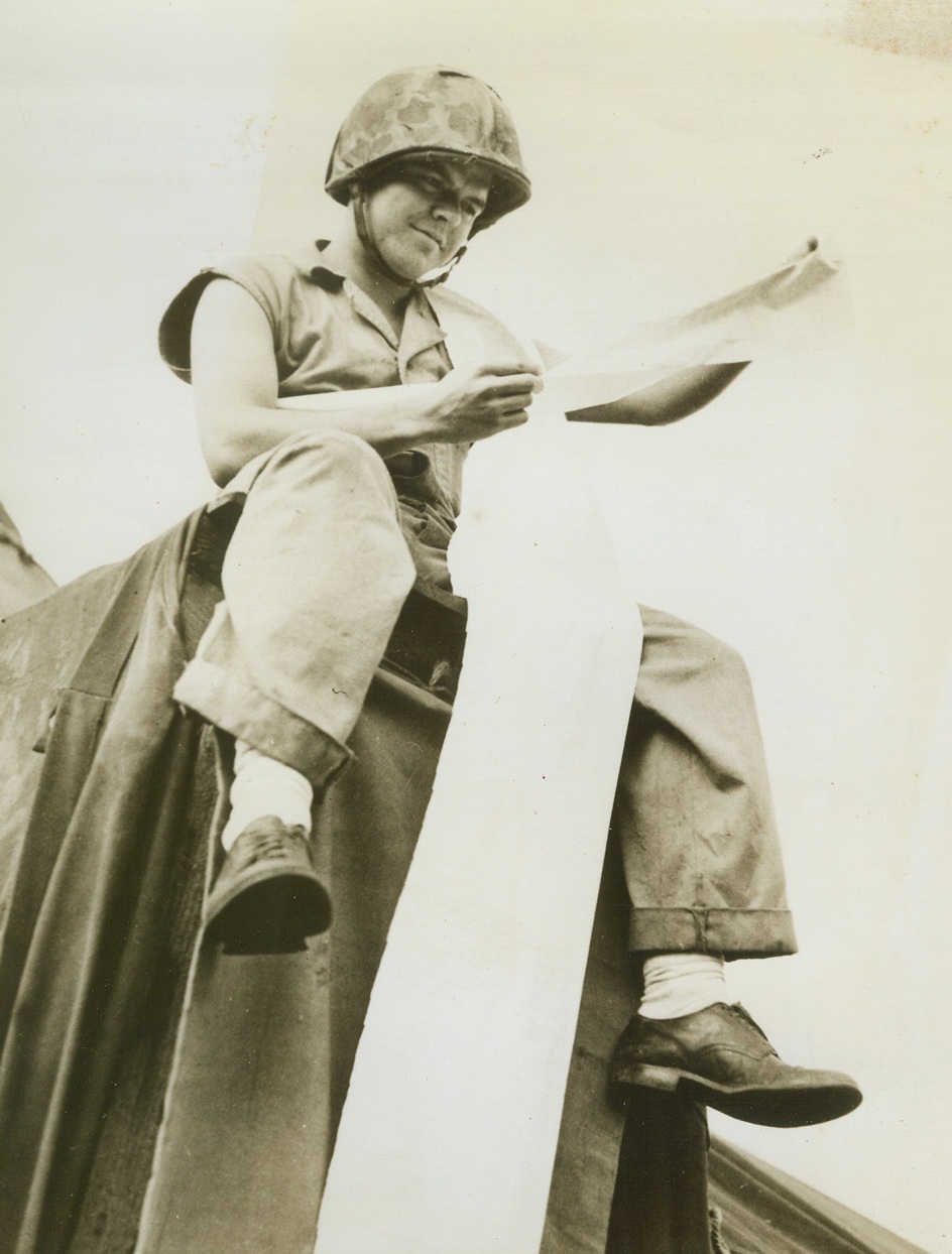 — But, No “Old Lace”!, 5/18/1944. South Pacific – A bitter dose to the Japs in the South Pacific, is this U.S. Marine Corps tank, appropriately dubbed “Arsenic”. Two of the battle-hardened crew members stand beside their “Nip Eliminator.” Left to right, are: Cpl. Rocky J. Bonoma, son of Mrs. Ida Bonoma, 6258 Cuyler Ave., Chicago, Ill.; and Sgt. Paul E. Wyers, son of Mrs. Martha Wyers, 410 Weatherly St., Borger, Texas. Credit line (U.S. Marine Corps photo from ACME);