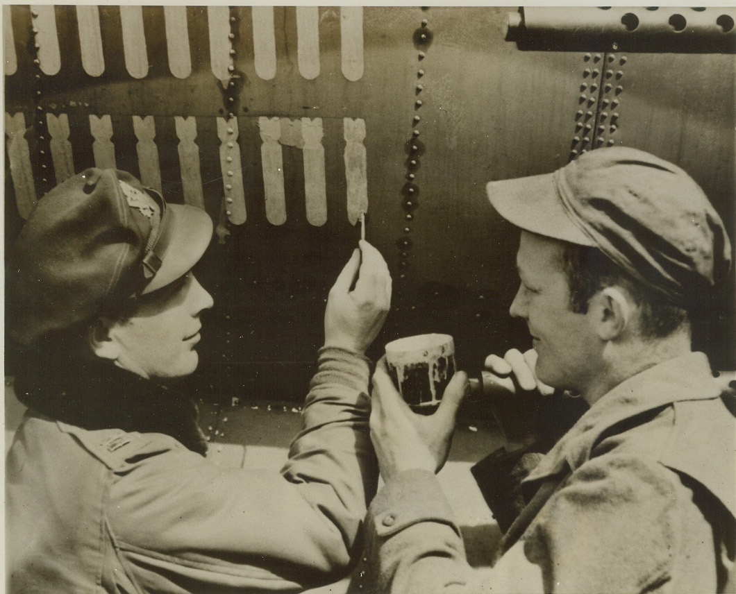 Chalking Up 100th Mission, 5/16/1944. ENGLAND — Capt. Paul Shannon (left), Attica, Kan., paints 100th bomb symbol on 9th Air Force Marauder medium bomber “Mild and Bitter” at an English base as T/Sgt. William L. Stuart, Donna, Tex., crew chief of the bomber, watches. Stuart has groomed the plane, the first in the E.T.O. to fly 100 missions, for every one of its flights. Credit:-WP-(ACME);