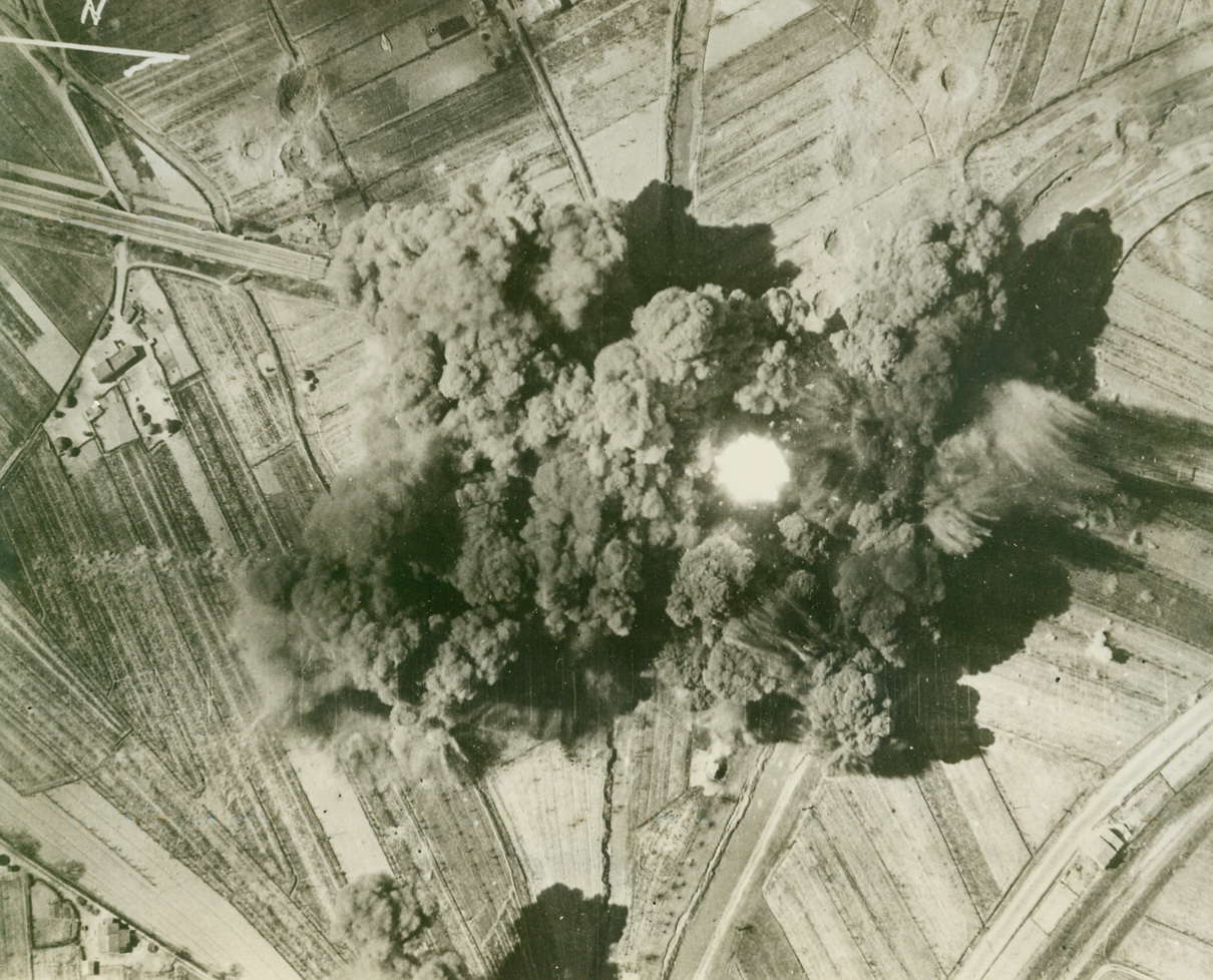 Ploesti Smashed Again by U.S. Airmen, 5/6/1944. PLOESTI, ROMANIA—Stepping up their non-stop pace in air offense, the Allies again hit the railroad marshalling yards at Ploesti and here Allied bombers wing over their target, leaving explosions and fires in their wake. The Flying Forts, based in Italy, were playing an early return engagement on the oil center which they attacked heavily not long ago. It appears that the Allies’ aim is to cripple German transportation and supply facilities as much as possible before the dawn of “D” day. Credit: OFFICIAL AAF PHOTO FROM ACME.;