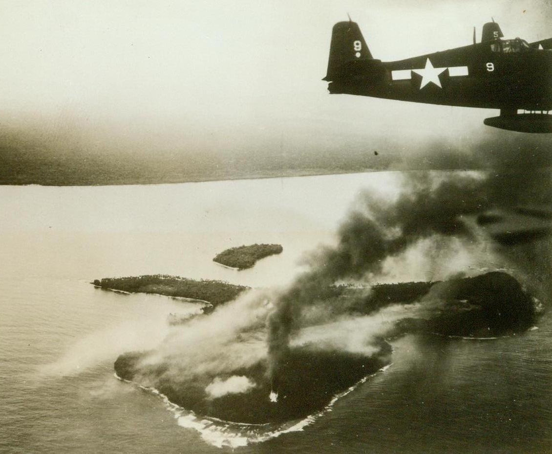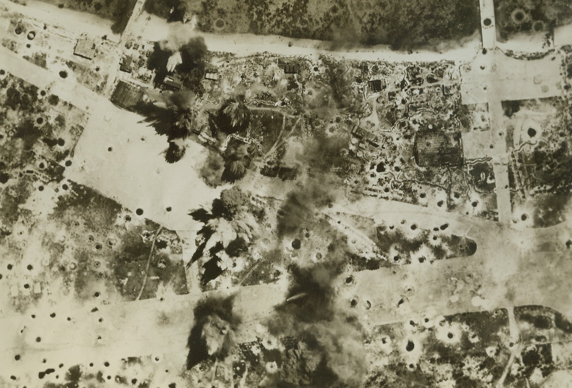 How To “Imobilize” Enemy Craft, 5/27/1944. New Guinea – Striking one day before the invasion of Hollandia, Navy Carrier-based planes from the giant task force which participated in the landings, blasted nearby Wakde Island. A Navy warplane is seen zooming far over burning Wakde after dropping its bombs. The Wakde Airfield was heavily hit; destroying many planes and “imobilizing” the field as a source of counterattack against the operation the following day. A month after the Hollandia victory, Wakde itself was taken. 5/27/44 (US Navy Photo From ACME);