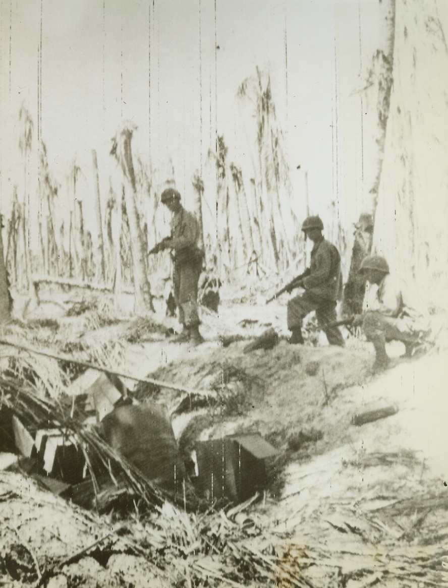 Trapping Nips on Wakde, 5/23/1944. Three U.S. Infantrymen, their guns held ready, advance cautiously on one of the few remaining pockets of Jap resistance on Wakde Island, off the coast of Dutch New Guinea – a battered pillbox. Today, Yanks are in full possession of the area and are using its airfield – a big step nearer the Philippines. Credit: ACME photo by Frank Prist for the War Picture Pool via Army Radiotelephoto;