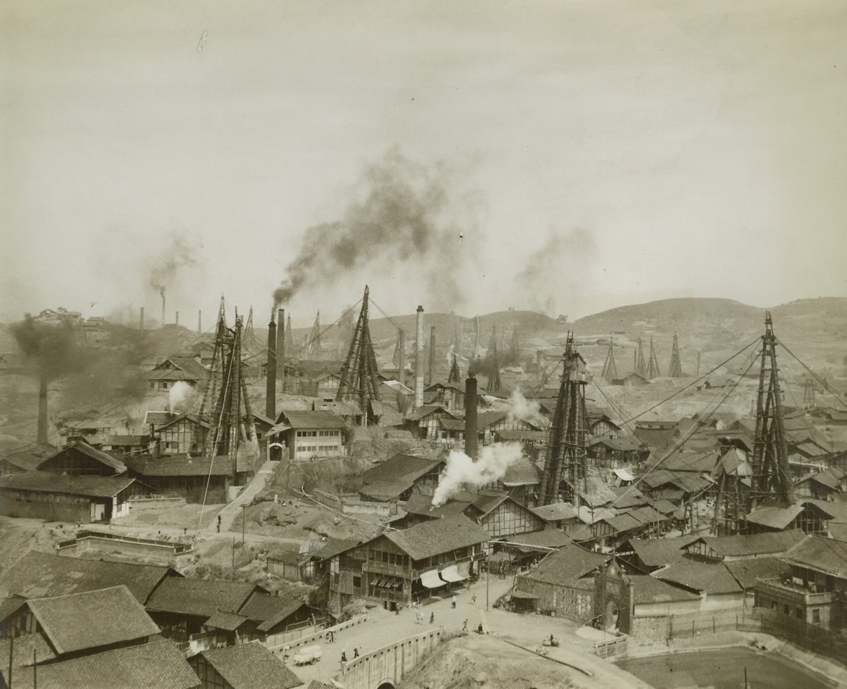 Salt for the Cellars of China, 5/23/1944. Tse Liu Ching, China – One of the most thriving industries in this area of China is the salt mines located at Tse Liu Ching. These mines, 2,600 years old, are cultivated by rustic methods, but nevertheless produce 250,000 metric tons of salt a year, or one fourth of all the salt produced in free China. Three hundred thousand laborers work the mines, from which salt is shipped to all parts of the East. Picture shows: A general view of a salt well city. The wells are from three to four thousand feet deep and take 4 years to dig. Credit: ACME photo by Frank Cancellare, War Pool Correspondent;
