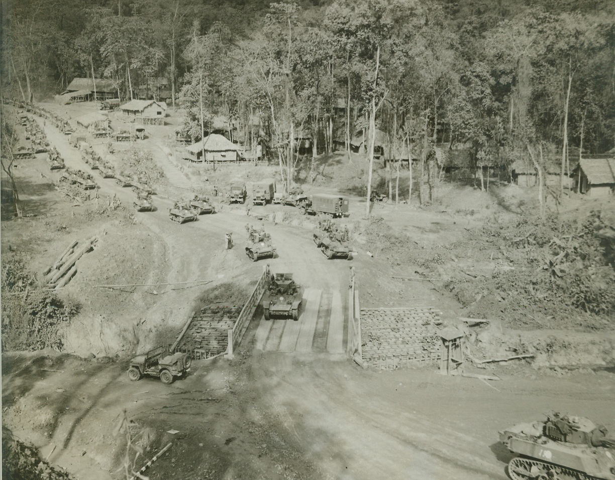 Yank Tanks Make Debut in Burma, 5/20/1944. Burma – To the American and Chinese jungle fighter troops in Burma have been added new mechanized units – American tanks now being used in the Hukawng Valley, the tanks have played a prominent part in driving back the Jap forces with resultant allied gains. The Chinese soldiers who man the battle-wagons have been trained by Americans and are fully equipped to use their vehicles to the best advantage. The tanks reached the battle area in Hukawng valley by traveling over the newly-constructed Ledo road, from Assam. To the valley the following pictures show the tanks in use in their new territory. New York Bureau Emerging from the hills around Assam, the tanks wind down the Ledo road en route to the battle front. The thatched huts are evidently part of a behind-the-lines Army camp. Credit (ACME photo by Frank Cancellare, War Pool correspondent);