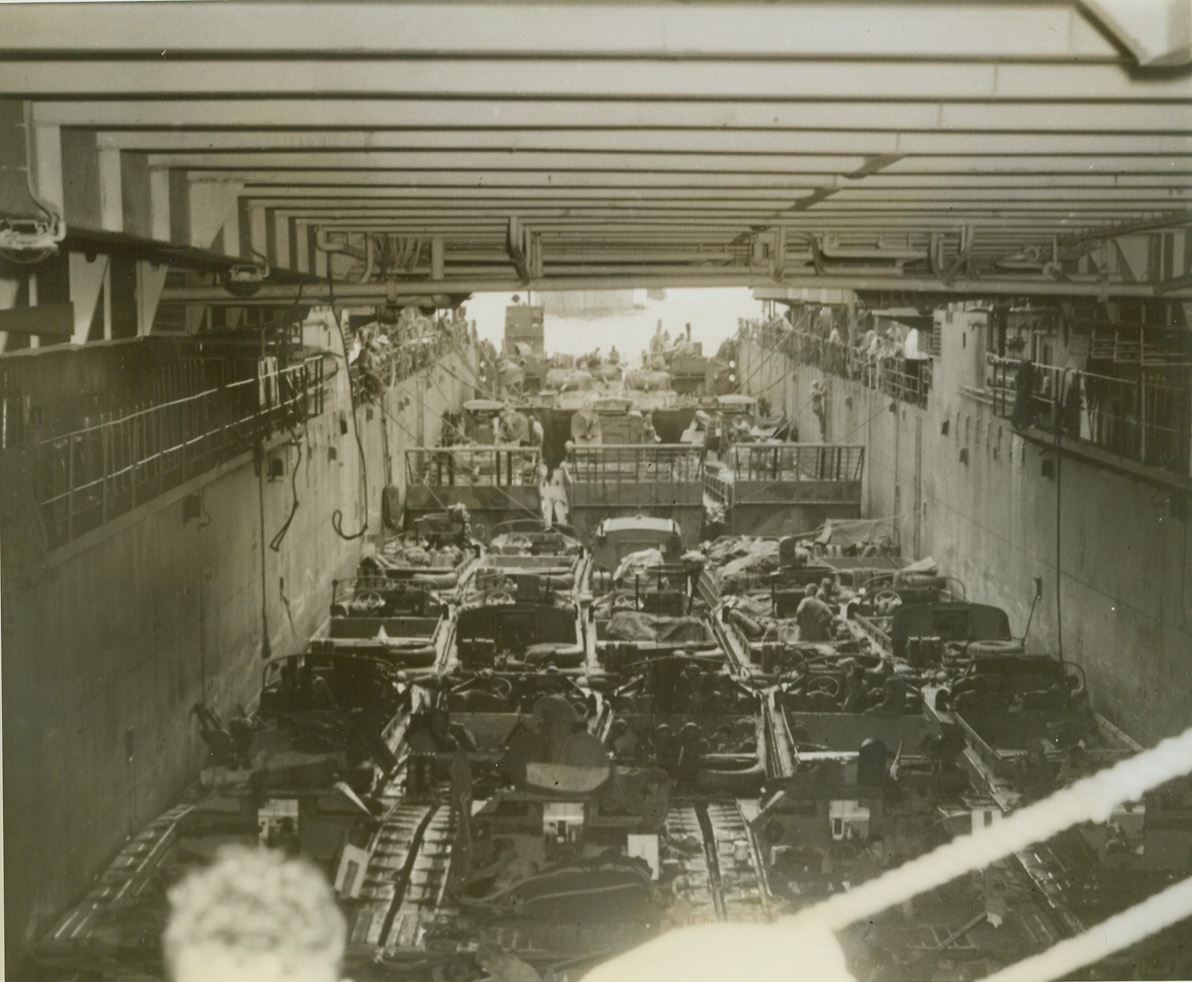 WELL LOADED, 5/8/1944. NEW GUINEA – The LSD (Landing Ship Dock) is shown somewhere in New Guinea, with its well deck loaded down with small craft. Included are LST (Landing Ship Tanks), Ducks, Buffaloes, and LSM (Landing Ship Mechanized). The smaller craft leave the mother vessel, water borne. In the recent invasion of Hollandia, Dutch New Guinea, there were Jap airplane engines, heavy guns, trucks, tractors, and other supplies, but few Japs. Our forces encountered minor opposition and are now at work wiping out the 60,000 Jap troops cut off from reinforcement and supply somewhere between Aitape and Hollandia. Credit: ACME photo by Tom Shafer, War Pool Correspondent;